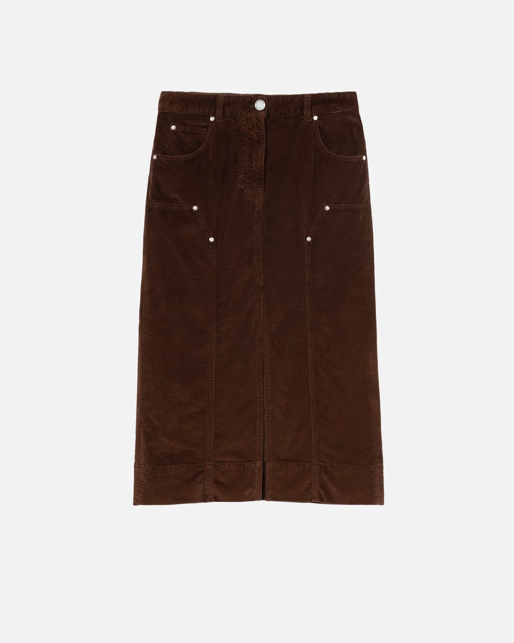 Straight-cut, five-pocket skirt in soft, stretch modal- and cotton-blend corduroy with fine ribbing. Midi-length garment with belt loops at the waist, slit in the middle at the bottom and workwear-inspired topstitching and rivets on the front. Metal zip and tack-button fastening.