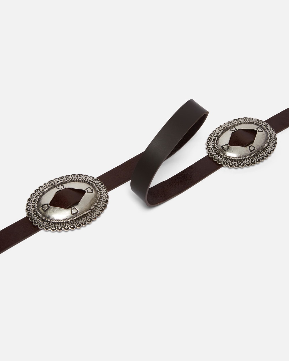 Ceinture fine en cuir, de 1 cm de large, avec plaques en métal galvanisé laiton vintage poli ornées de gravures décoratives.