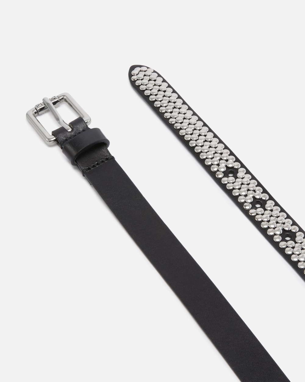 Ceinture fine pour femme, de 2 cm de large, en cuir vieilli brillant, agrémentée de petits clous en métal créant un effet bijou sur le devant. Petite boucle carrée à rouleau en métal.