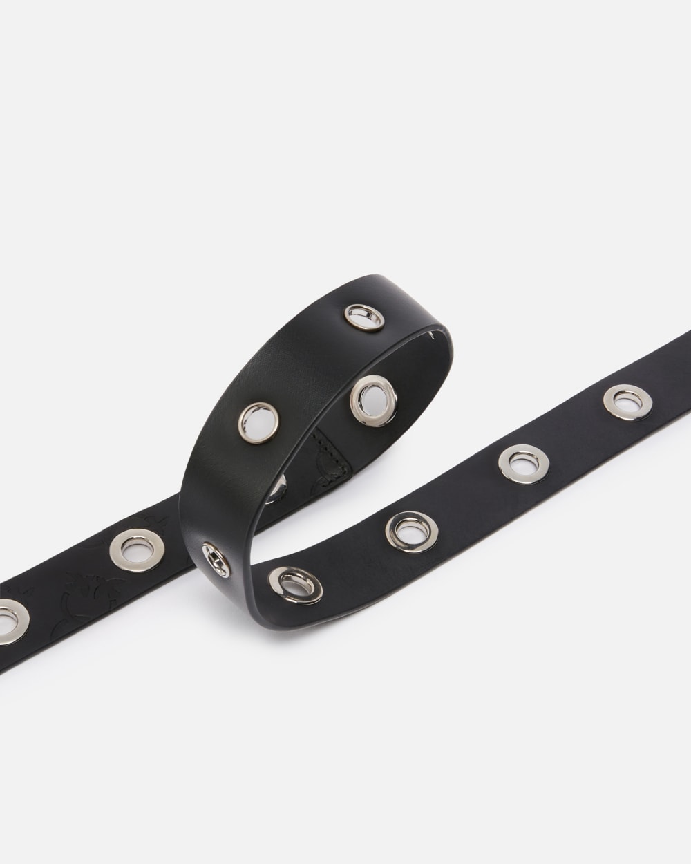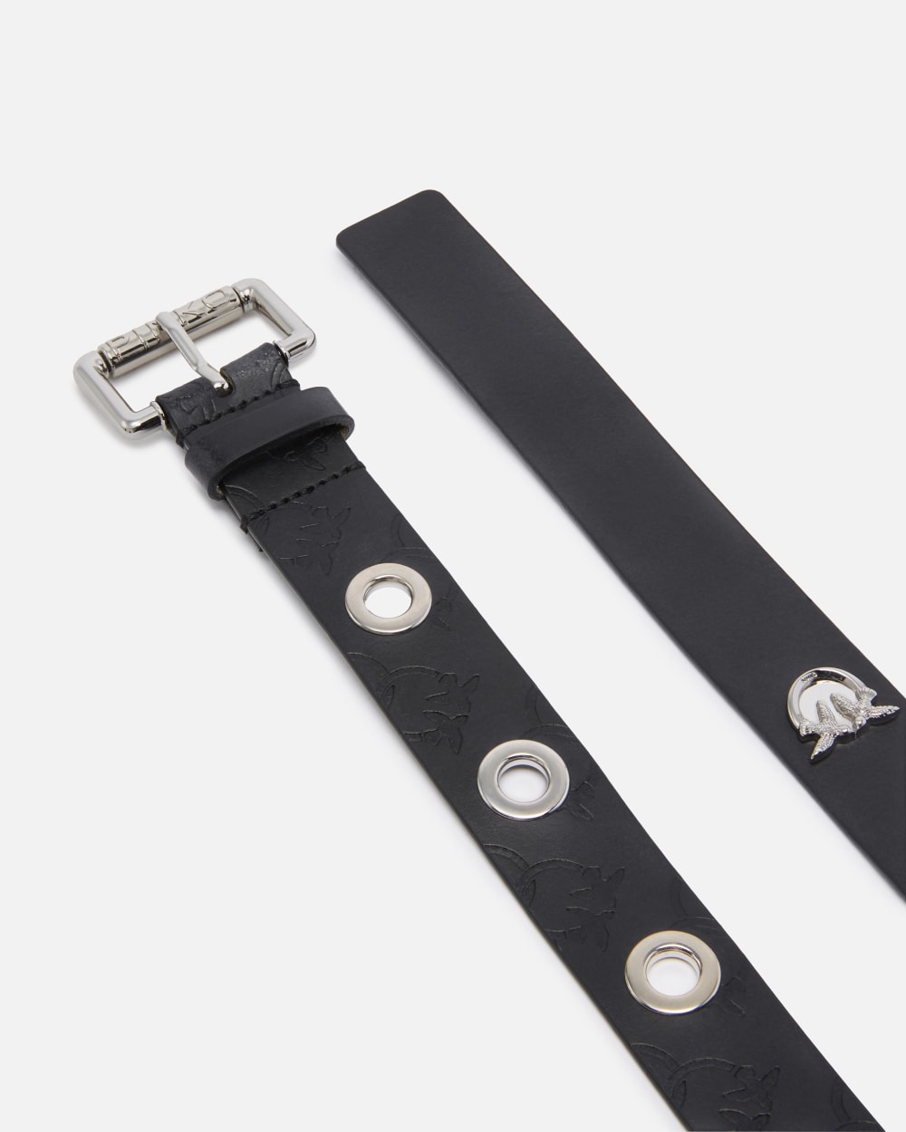 Ceinture en cuir de 3 cm de large avec imprimé Love Birds Monogram, illets plats en métal et boucle à rouleau griffée du logo PINKO en métal nickelé brillant.