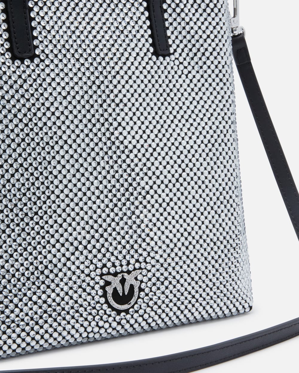 Sac à main façon cabas en cuir lisse orné de strass all-over et griffé dune plaquette à logo Love Birds Diamond Cut en métal agrémentée de pavés de strass. Ce petit cabas est l’accessoire idéal pour accompagner vos looks lors des grandes occasions. Il se porte à la main, grâce à sa double anse supérieure, ou en bandoulière, grâce à sa bandoulière assortie en cuir amovible, munie de petits mousquetons. Modèle avec doublure en polycoton et fermeture zippée sur le dessus. Activez votre sac PINKO : vérifiez lauthenticité de votre article et accédez à une expérience personnalisée en approchant votre smartphone de la broderie Love Birds à larrière du sac !