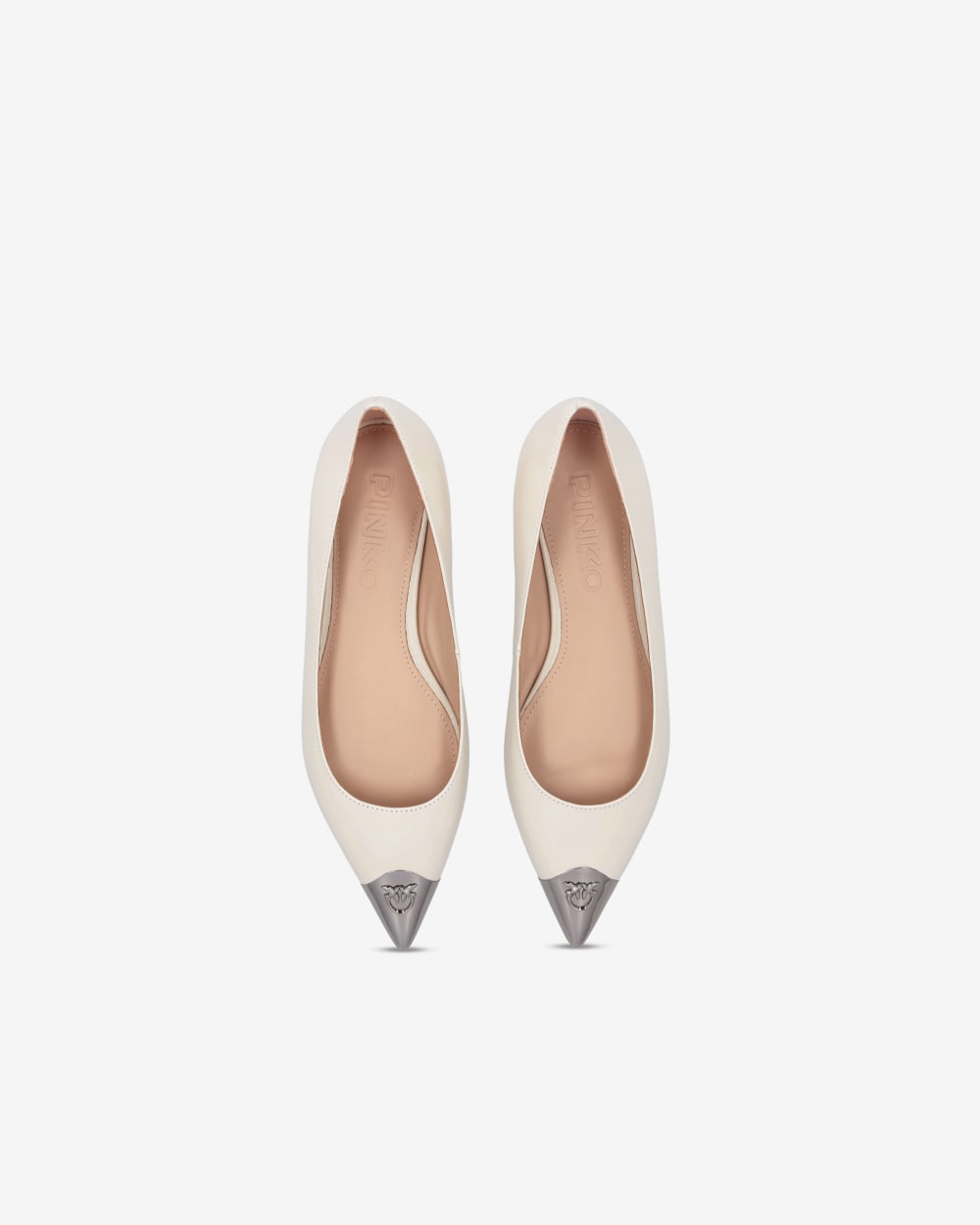 Ballerines plates en cuir nappa avec bout pointu en métal griffé dune plaquette à logo Love Birds. Semelle en tunit, un matériau synthétique semblable au cuir, talon plat de 1,5 cm, semelle intérieure et doublure en cuir.