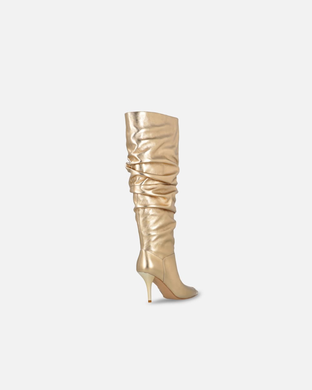 Bottes au genou en cuir nappa lamé effet doré. Bout pointu en métal griffé dune plaquette à logo Love Birds et tige froncée avec zip sur le côté intérieur pour faciliter lenfilage. Semelle en tunit, un matériau synthétique semblable au cuir, talon stiletto de 9 cm, semelle intérieure et doublure en cuir.