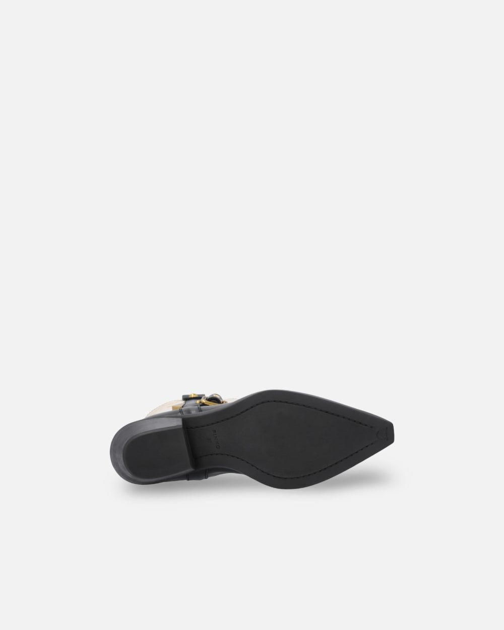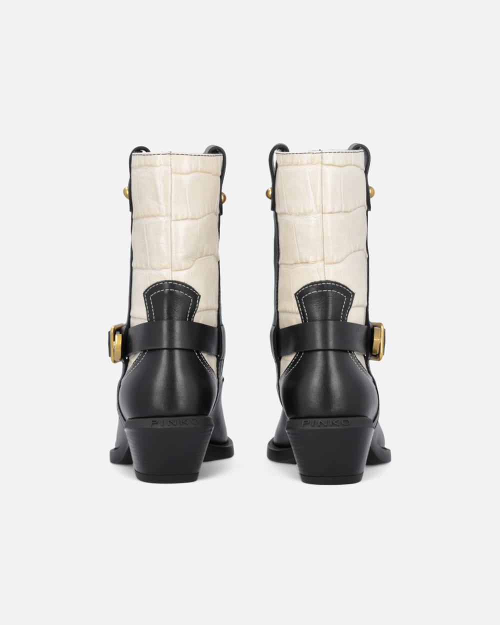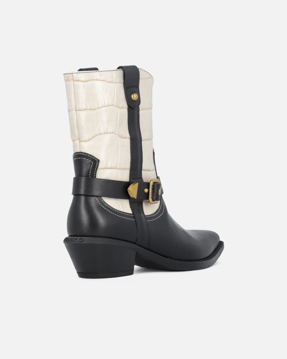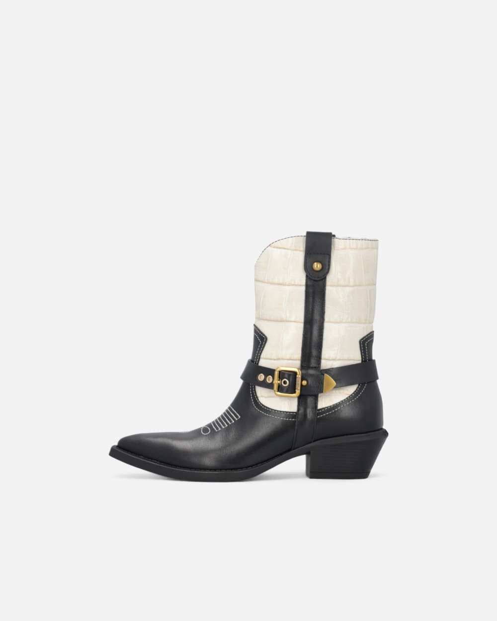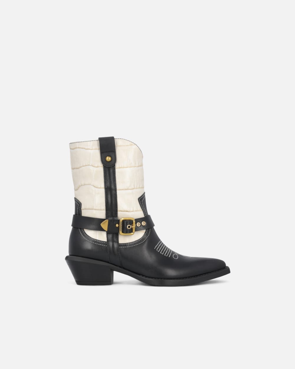 Bottines façon santiag en cuir lisse avec tige au mollet en cuir embossé crocodile contrastant. Bout pointu avec broderie style western et bride avec boucle en métal. Semelle en caoutchouc, talon cubain de 5 cm, semelle intérieure et doublure en cuir.