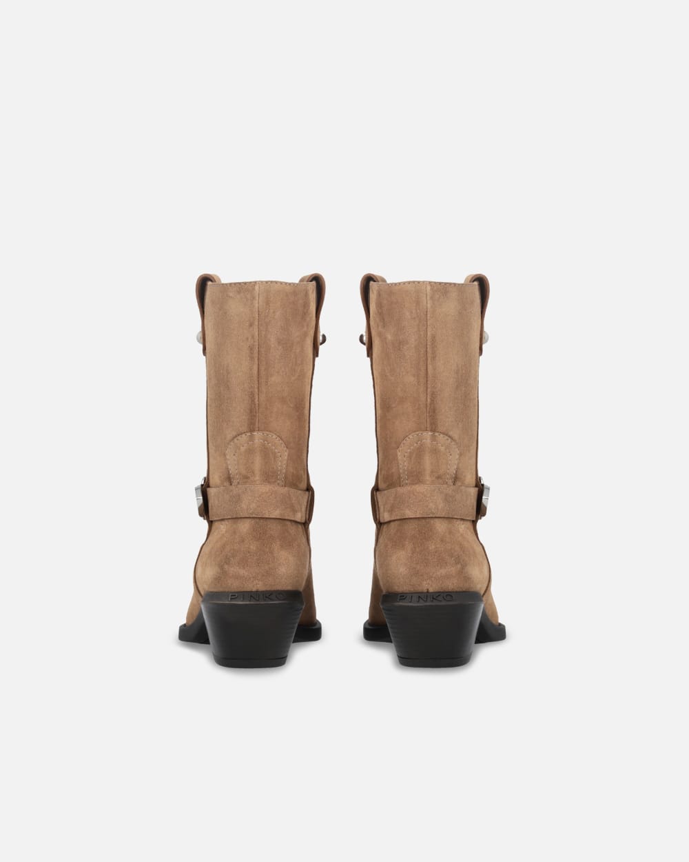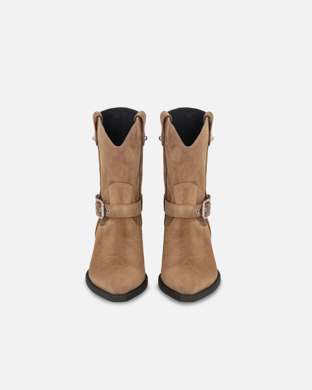 Bottines façon santiag en daim souple avec tige au mollet. Bout pointu avec broderie style western et bride avec boucle en métal. Semelle en caoutchouc, talon cubain de 5,5 cm, semelle intérieure et doublure en cuir.