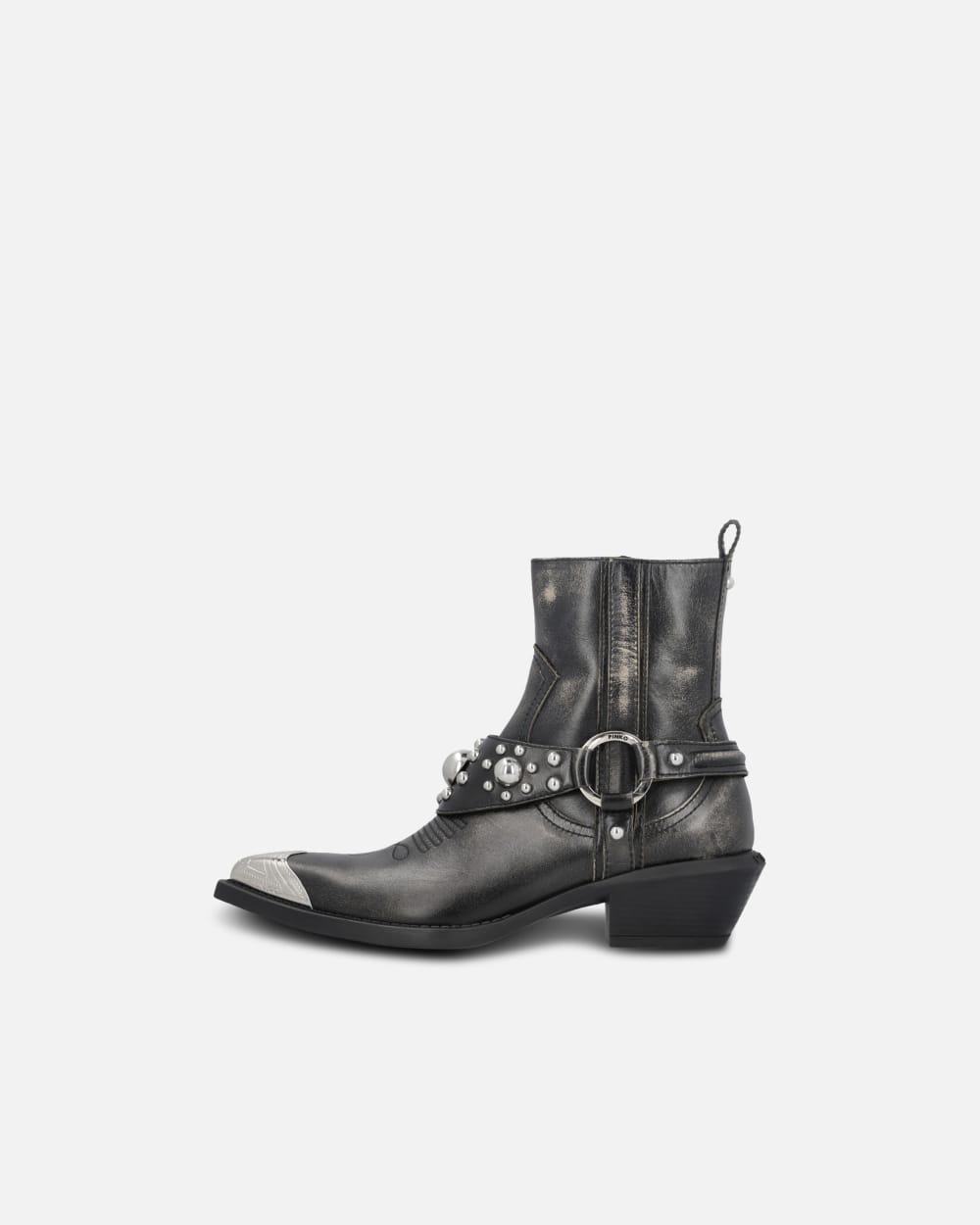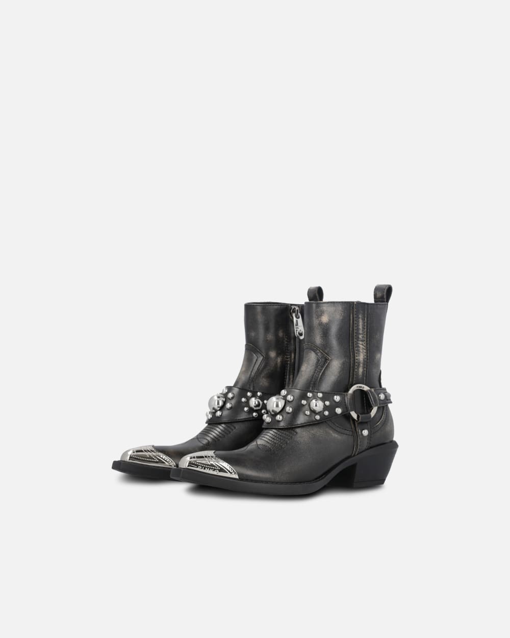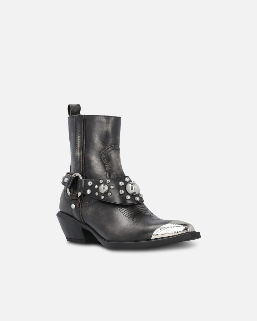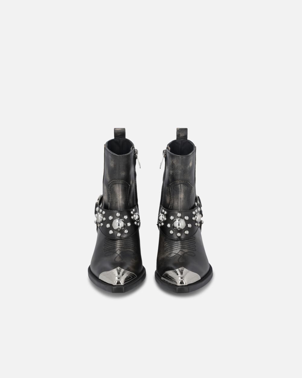 Bottines à la cheville façon ankle boots en cuir brossé, pour un look unique et élégant. Le bout pointu présente une finition en métal et une broderie dinspiration western orne lempeigne. Le modèle est complété par une bride rehaussée de clous métalliques appliqués. Glissière positionnée sur côté intérieur pour faciliter lenfilage. Semelle en caoutchouc, talon cubain de 5 cm, semelle intérieure et doublure en cuir.