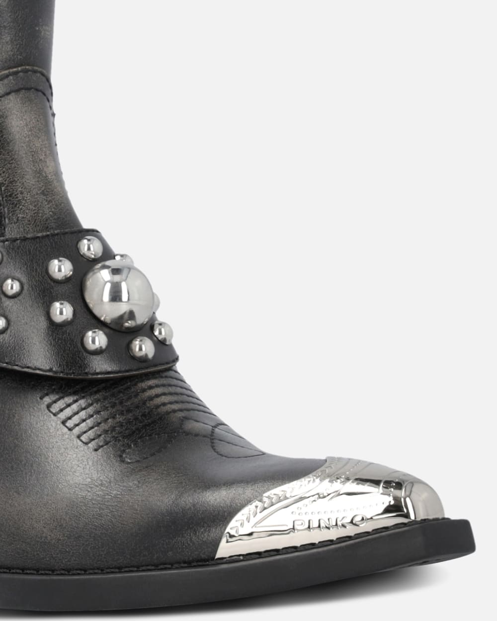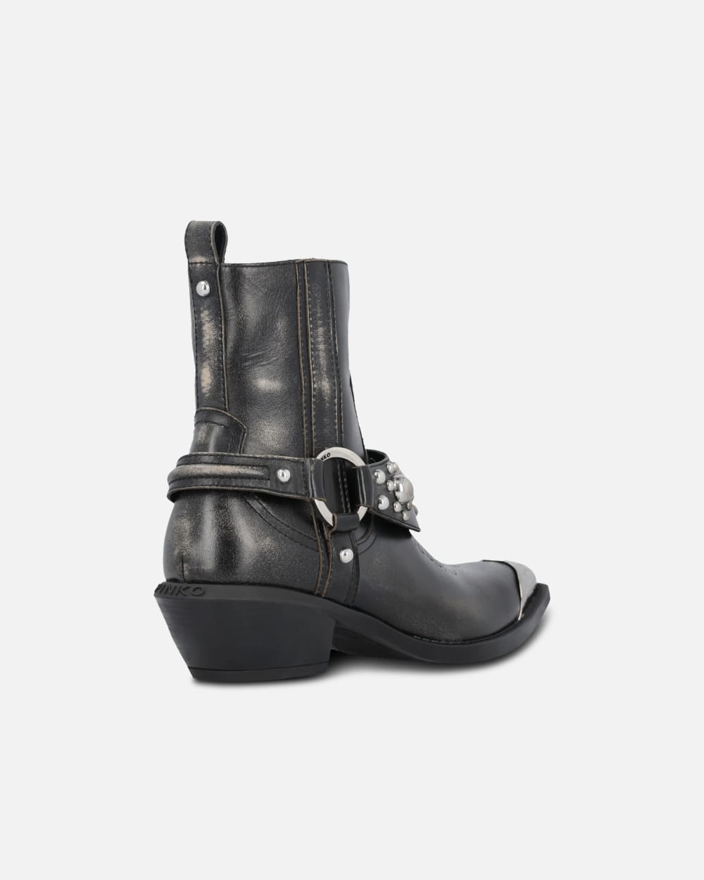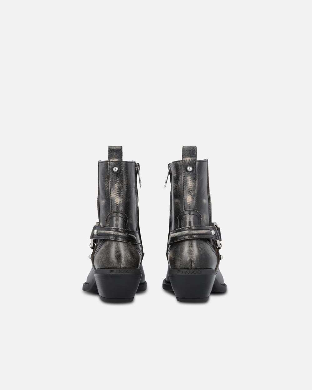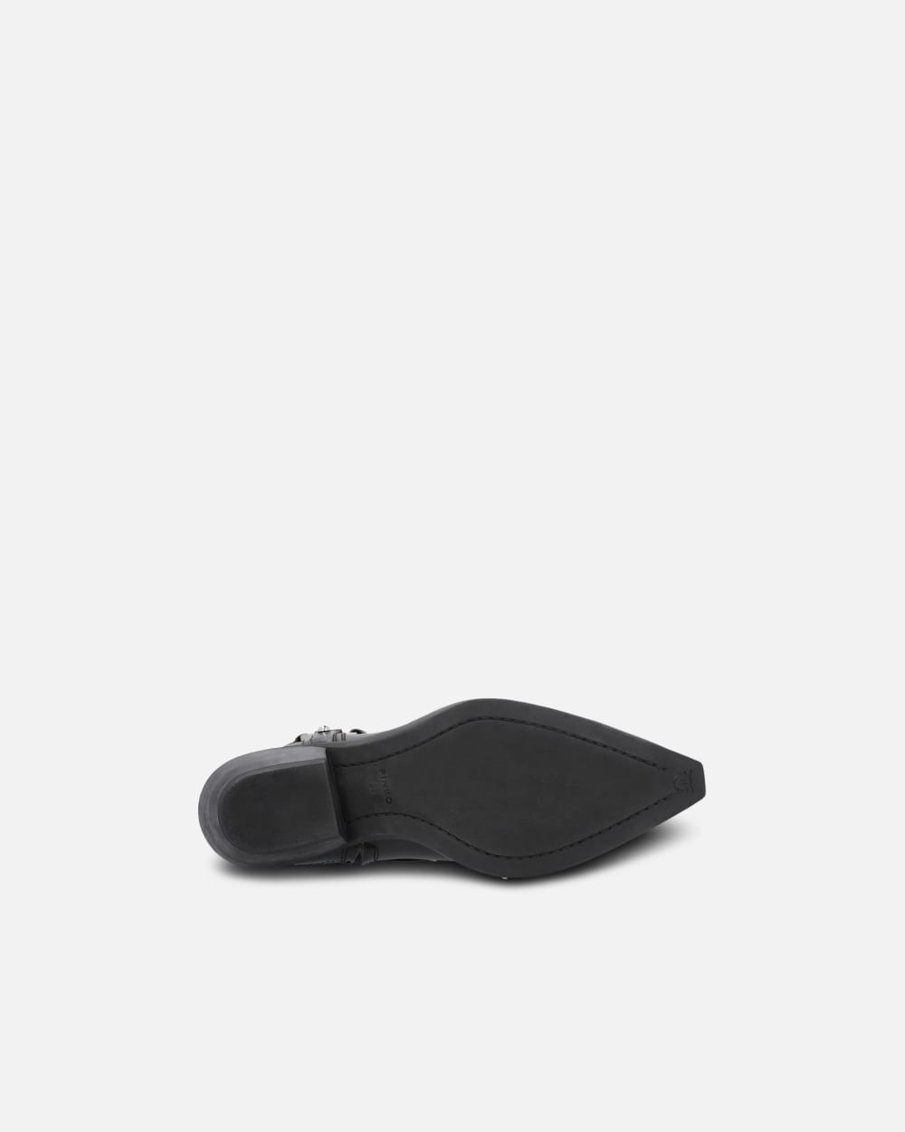 Bottines à la cheville façon ankle boots en cuir brossé, pour un look unique et élégant. Le bout pointu présente une finition en métal et une broderie dinspiration western orne lempeigne. Le modèle est complété par une bride rehaussée de clous métalliques appliqués. Glissière positionnée sur côté intérieur pour faciliter lenfilage. Semelle en caoutchouc, talon cubain de 5 cm, semelle intérieure et doublure en cuir.