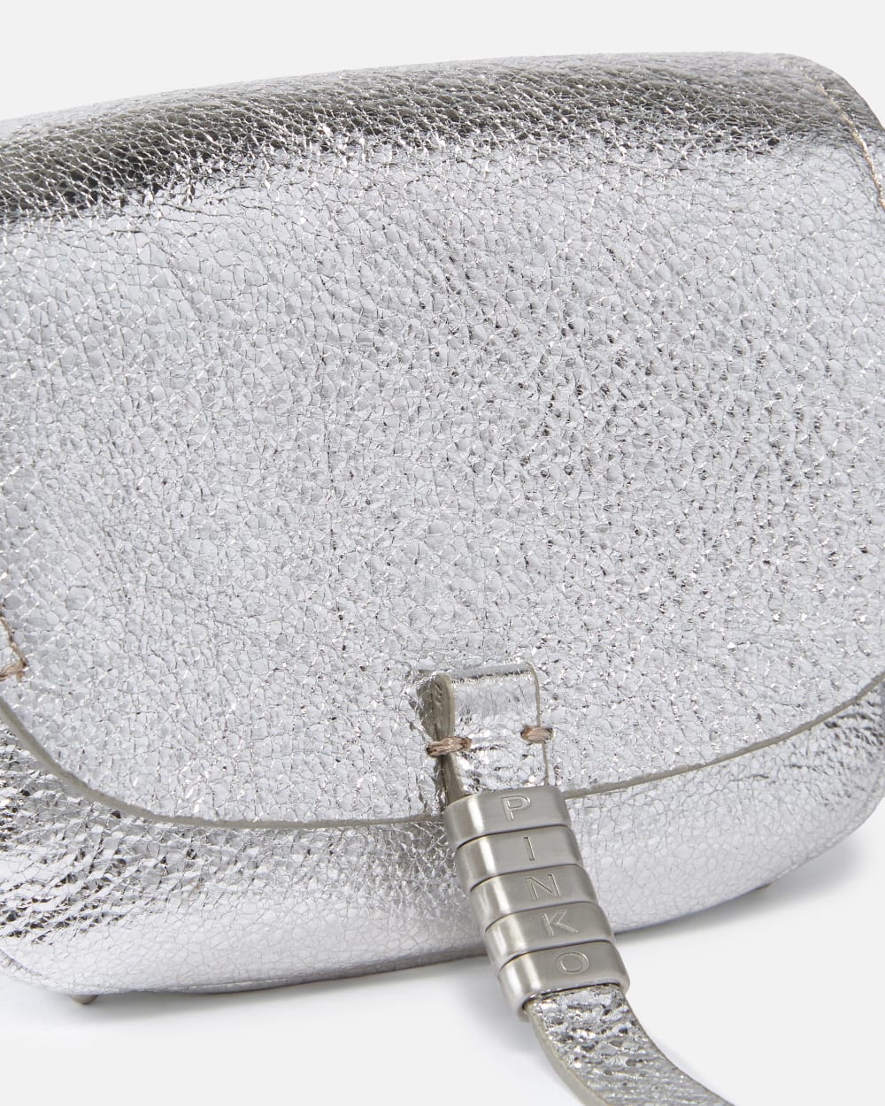 Petit sac à bandoulière semi-rigide Micro Saddle Bag en cuir lamé froissé. Idéal pour les soirées et les grandes occasions, ce sac à main légèrement arrondi à rabat présente une série de breloques en métal griffées du logo PINKO. Sa bandoulière tubulaire en cuir est dotée daccessoires en métal et de nuds décoratifs au niveau de lattache. Activez votre sac PINKO : vérifiez lauthenticité de votre article et accédez à une expérience personnalisée en approchant votre smartphone de la broderie Love Birds à larrière du sac !