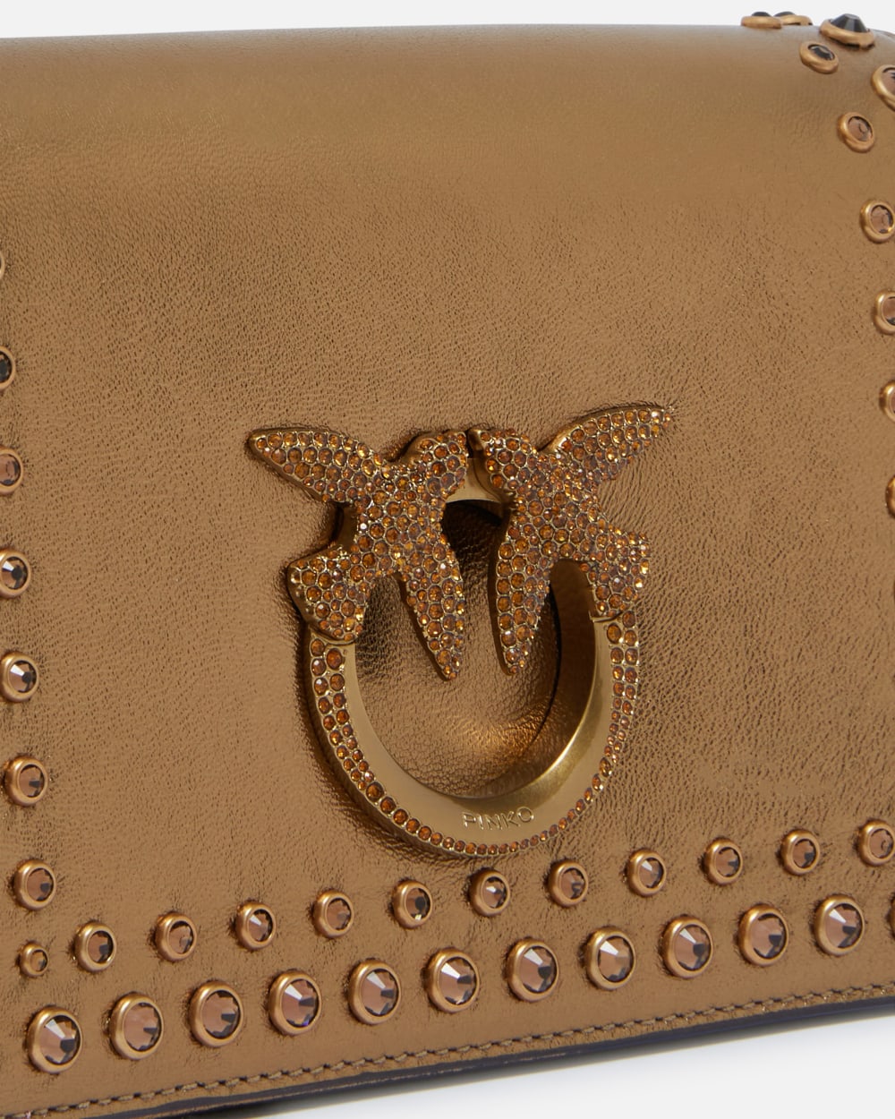 Sac à bandoulière Mini Love Bag en cuir nappa lamé avec strass ton sur ton appliqués sur le bord du rabat devant comme au dos. Petit sac rigide doté d’une bandoulière chaîne en métal fixe et d’une patte dépaule réglable en cuir nappa. Modèle avec doublure en daim microfibre et compartiment zippé pratique. La fermeture par bouton magnétique invisible arbore la boucle à logo Love Birds Diamond Cut en métal agrémentée de strass enchâssés pour une touche déclat supplémentaire. Ce mini sac est parfait pour apporter une touche PINKO emblématique à vos tenues de cérémonie. Activez votre sac PINKO : vérifiez lauthenticité de votre article et accédez à une expérience personnalisée en approchant votre smartphone de la broderie Love Birds à larrière du sac !