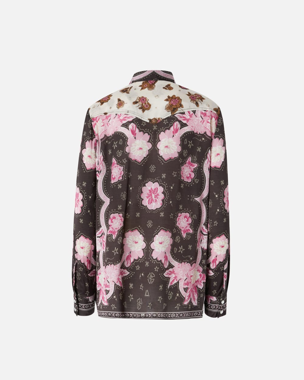 Chemise style western pour femme en twill fluide de viscose à imprimé floral placé combinant différents motifs aux tons rose et marron. Modèle avec col chemise, empiècement arrondi sur le devant et pointu au dos et manches longues à poignets. Une chemise parfaite pour apporter une touche originale et féminine à votre jean préféré. Fermeture par boutons-pression façon nacre.