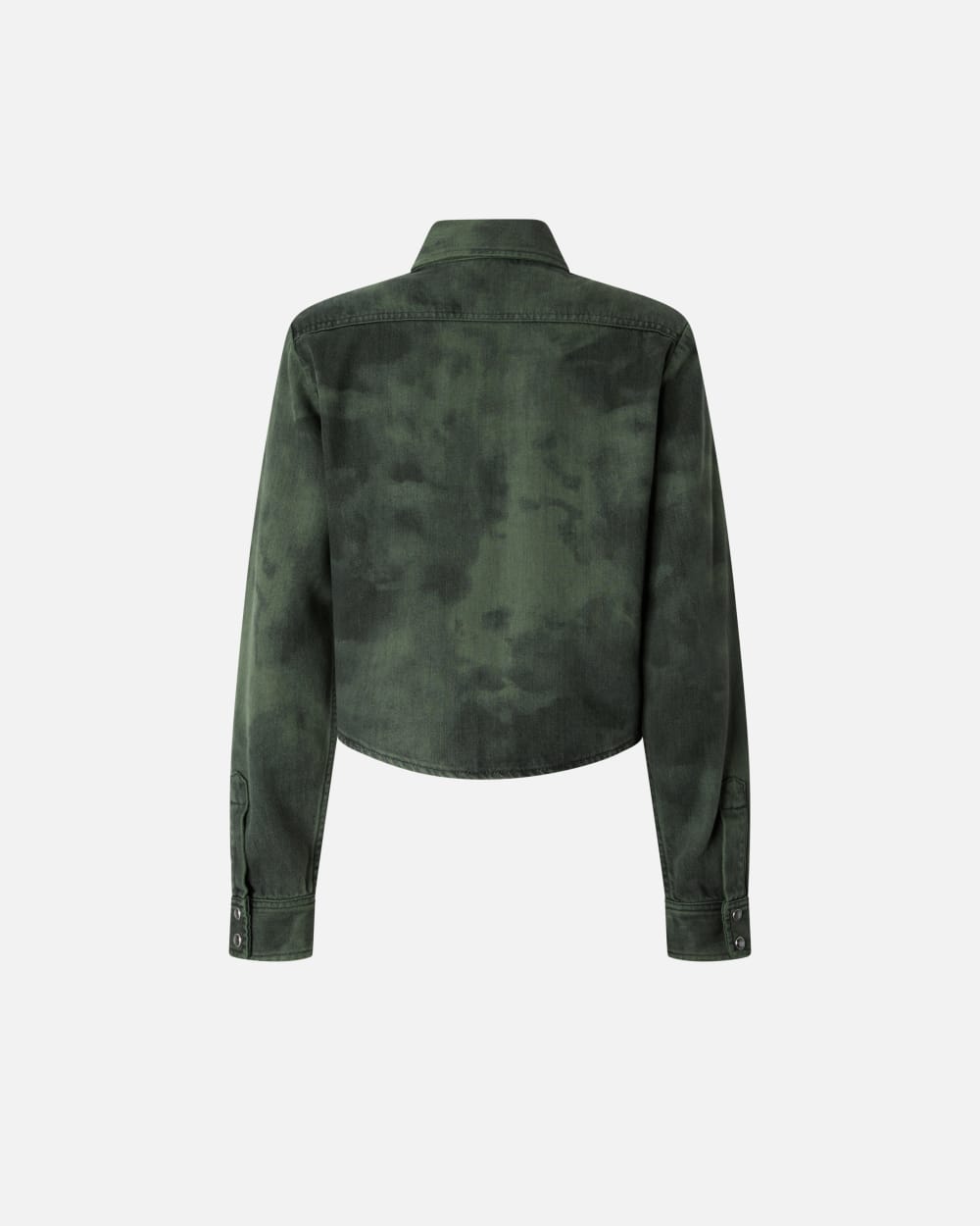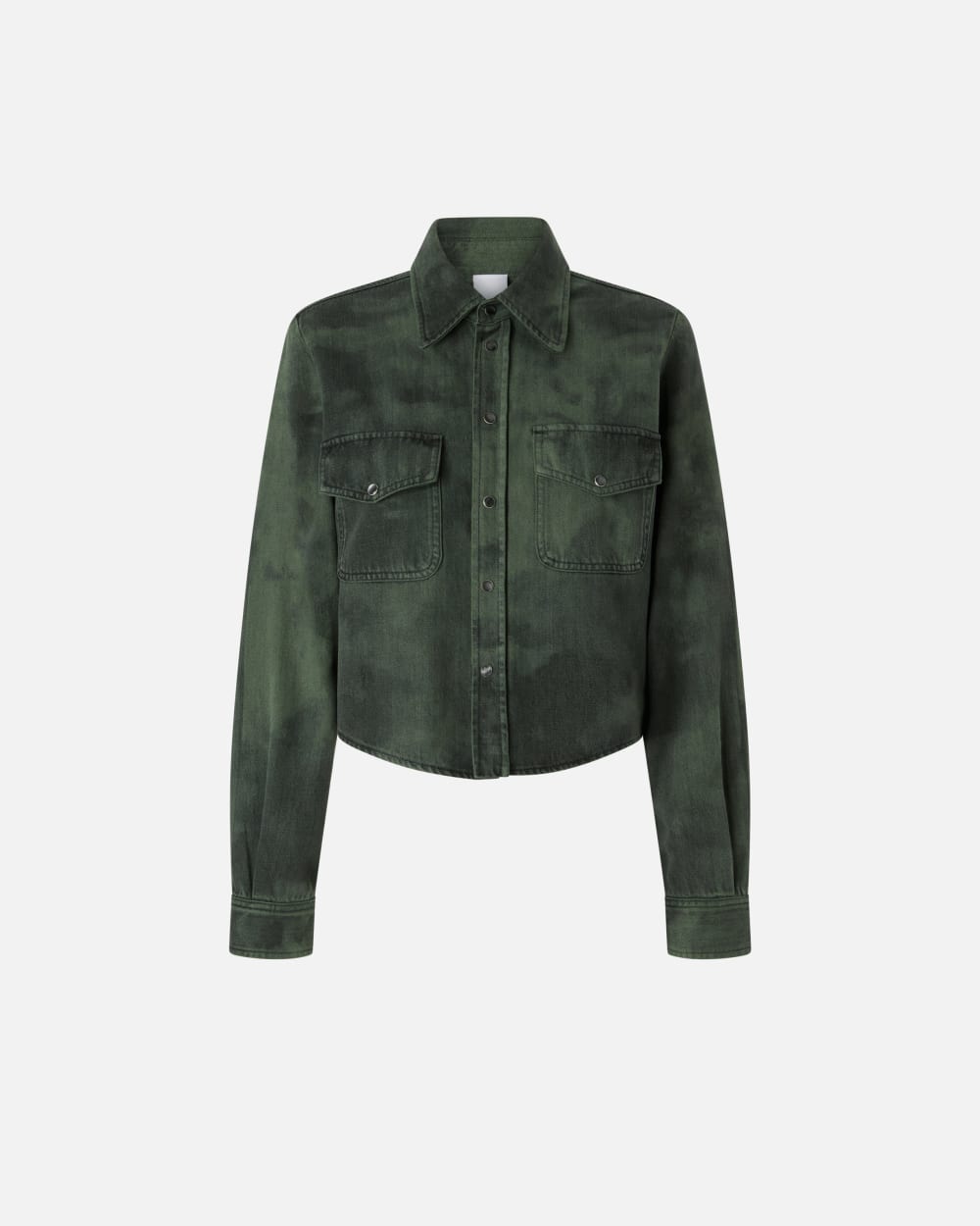 Chemise courte en denim de coton et lyocell tacheté noir : un effet camouflage imprimé au laser, puis surteint. Col classique, manches longues légèrement amples et poches poitrine plaquées à rabat boutonné. Fermeture pressionnée sur le devant.
