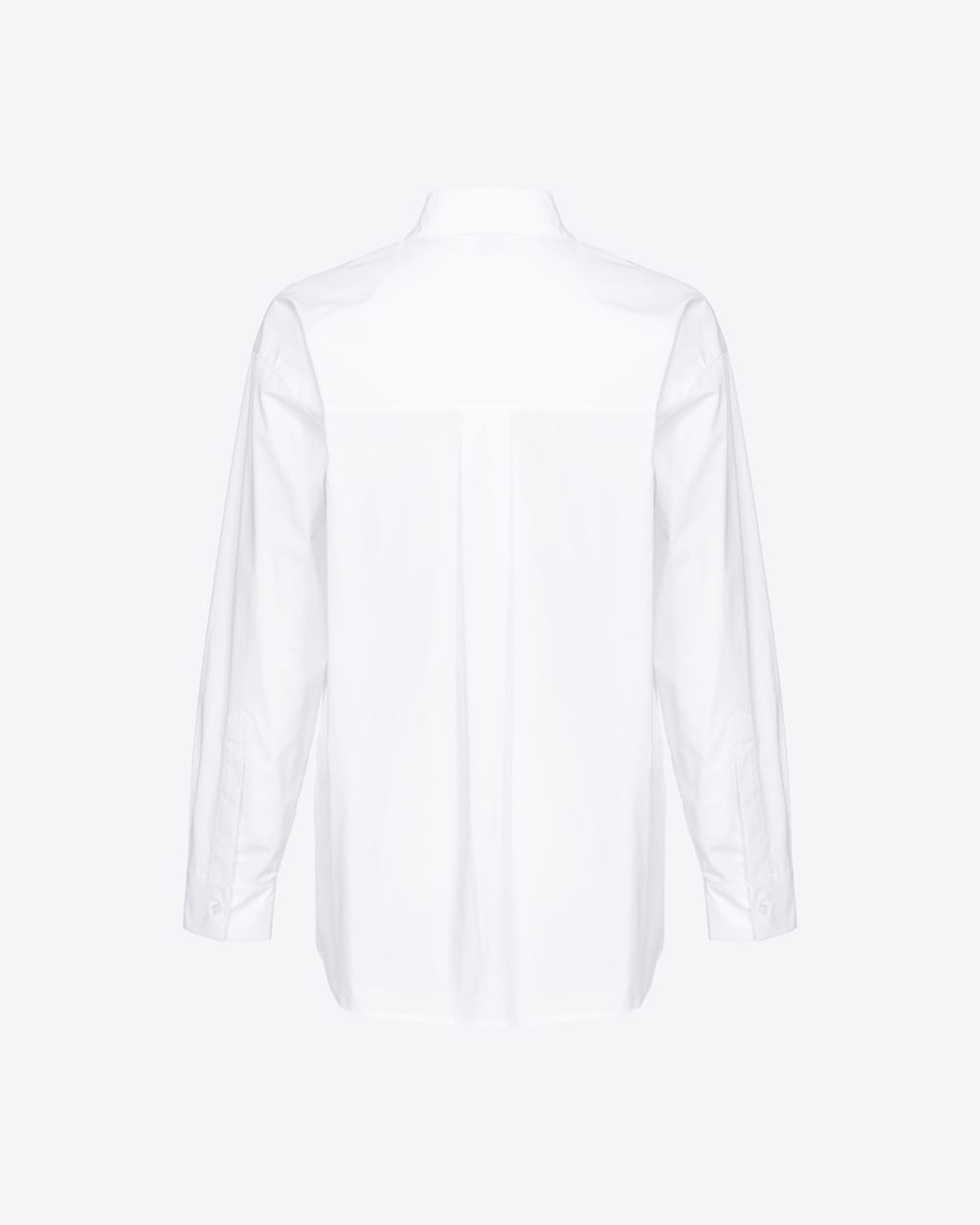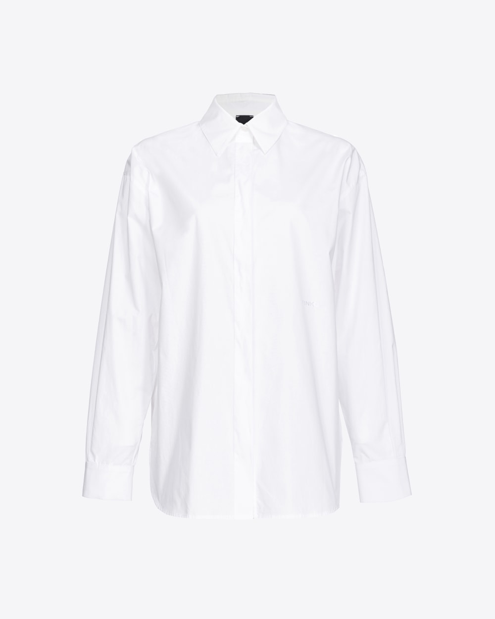 Chemise coupe classique, volume légèrement oversize, en popeline 100% coton. Col col classique, manches longues avec poignets. Mini logo PINKO brodé à l’avant. Fermeture boutonnée cachée, seul le premier bouton est visible.