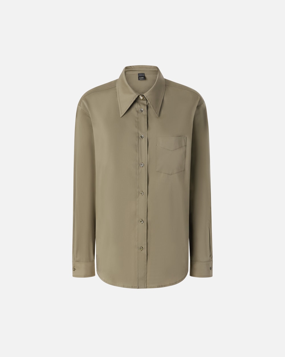 Chemise coupe classique, volume légèrement oversize, en popeline 100% coton. Col col classique, manches longues avec poignets. Mini logo PINKO brodé à l’avant. Fermeture boutonnée cachée, seul le premier bouton est visible.