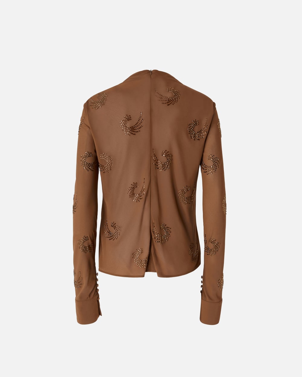 Blouse féminine en léger crêpe Georgette rehaussée dun petit motif tourbillons en strass all-over. Coupe près du corps à petit col officier et manches longues ornées de petits boutons en bas, sur le côté intérieur. Une pièce féminine et précieuse pour jouer la carte de lélégance en soirée.