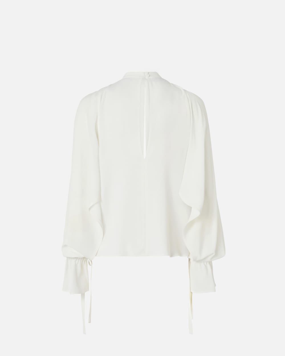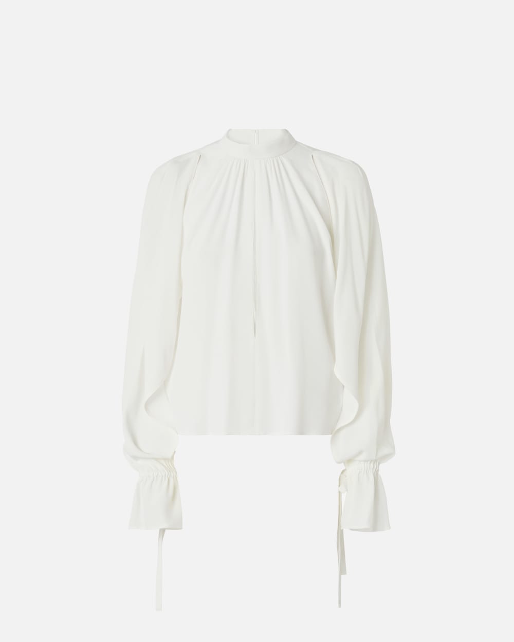 Blouse boxy en crêpe de Chine de soie mélangée. Petit col officier avec découpe verticale sur le devant et fermeture goutte deau à double bouton au dos. Les manches longues volantées et ouvertes en bas présentent un poignet noué dun ruban. Le tissu principal est fabriqué avec 69% de viscose provenant de forêts gérées de manière responsable.