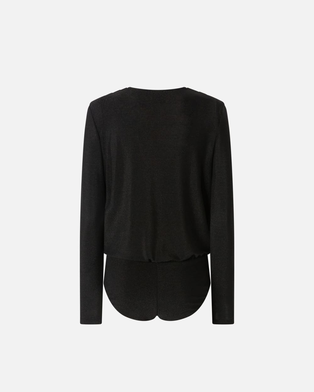 Body à manches longues pour femme en jersey de viscose mélangée stretch à leffet métallisé original et élégant. Sa coupe croisée sur le devant est rehaussée de détails drapés pour une touche féminine. Une pièce essentielle pour un look de soirée scintillant et féminin tout en discrétion.