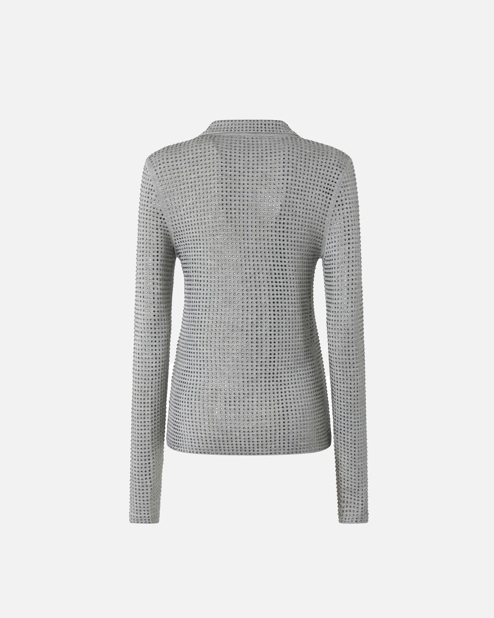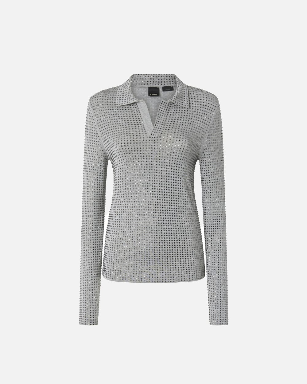 T-shirt à manches longues pour femme en jersey de viscose mélangée stretch rehaussé de strass all-over, devant comme au dos. Modèle ajusté à col polo à associer à la jupe crayon assortie pour un total look scintillant sensationnel.