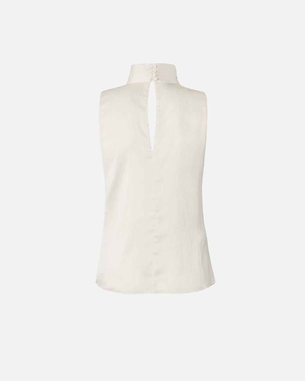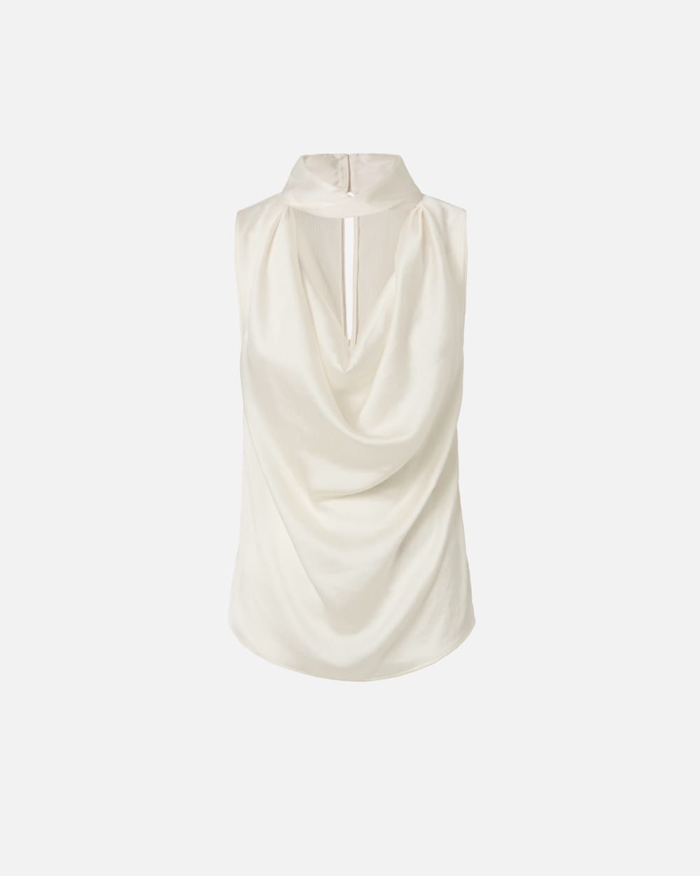 Top sans manches en satin légèrement ondulé. Devant avec drapé créant un décolleté profond. Col montant et fermeture goutte deau boutonnée sur la nuque.
