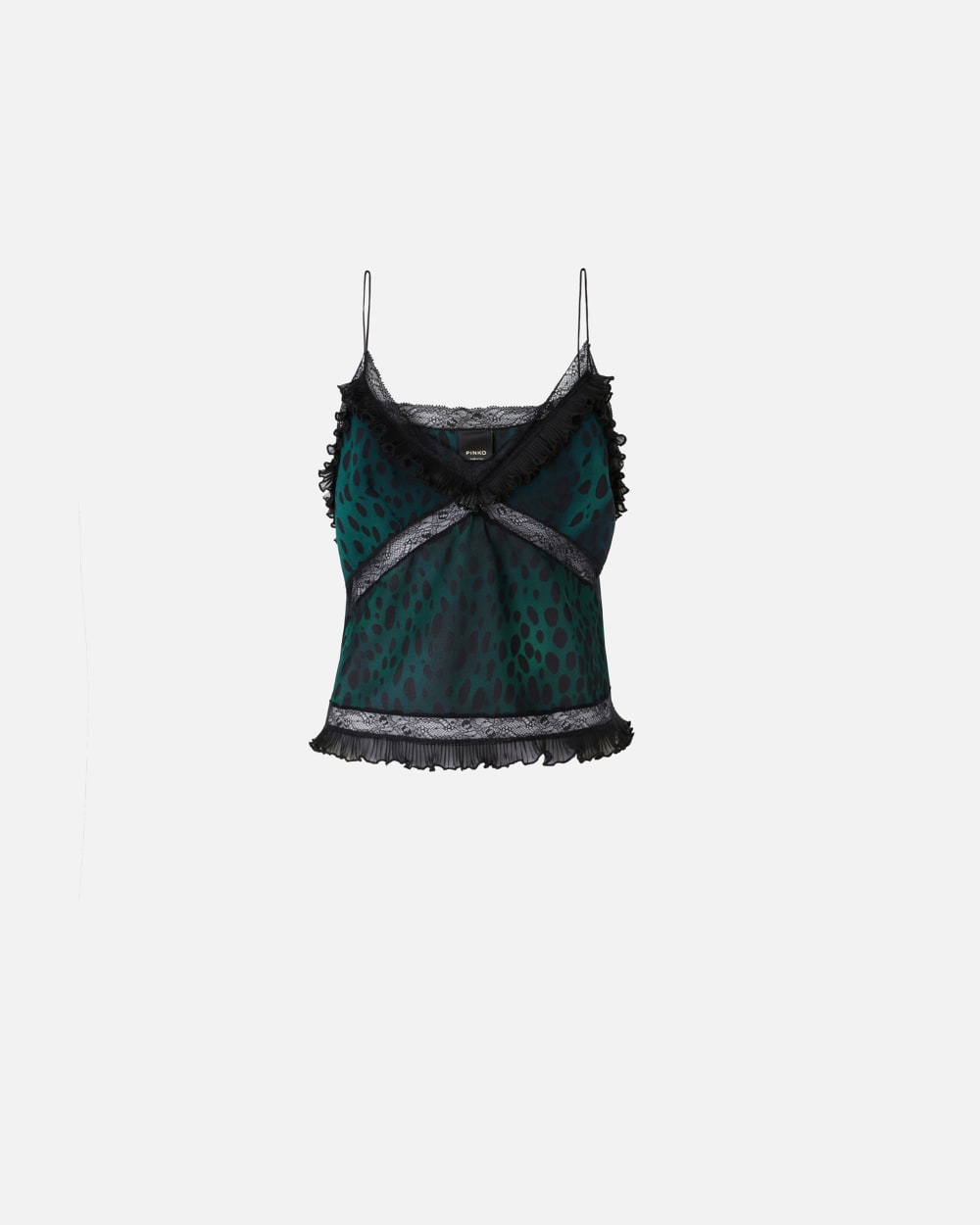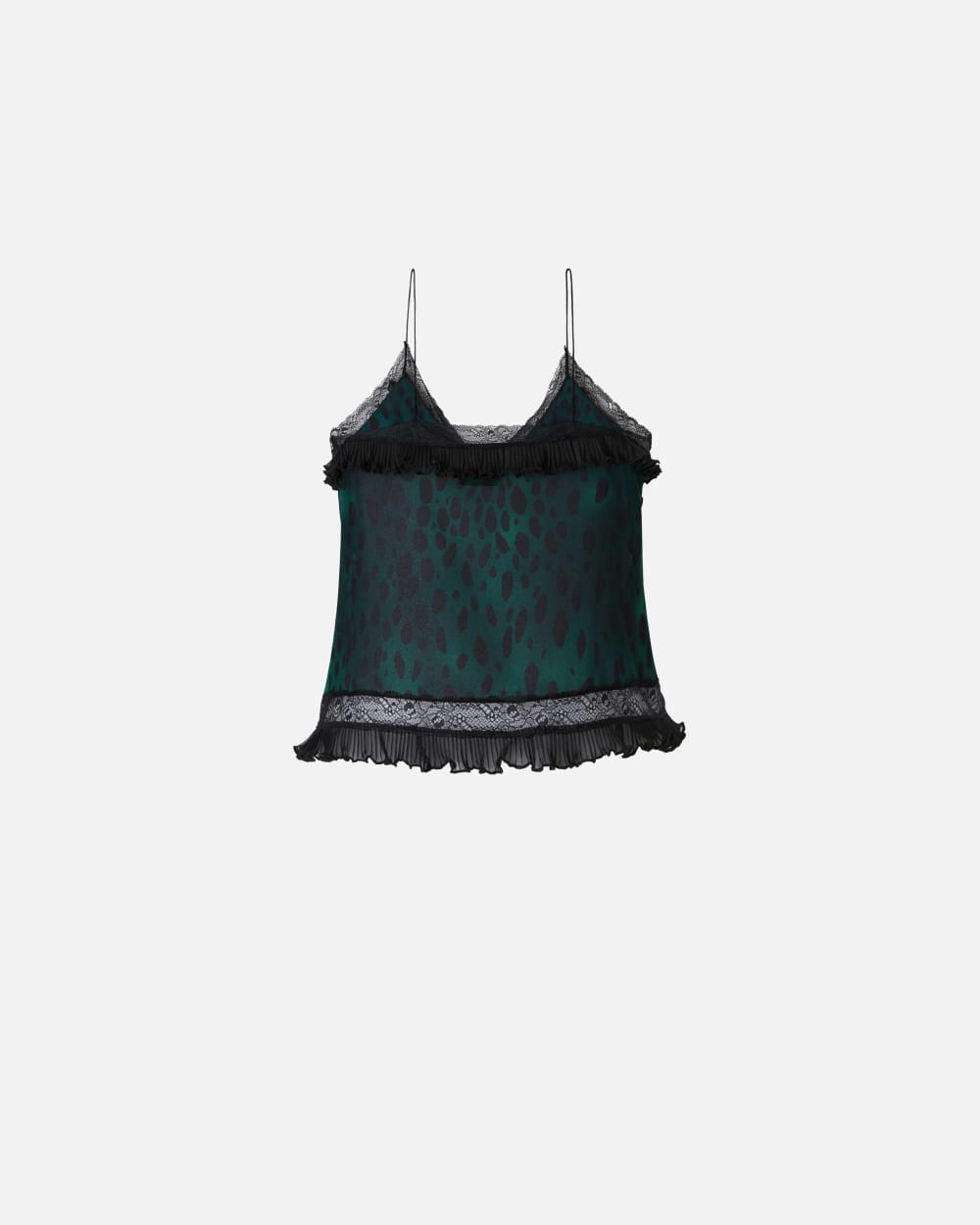 Top court sans manches en léger crêpe Georgette à imprimé animalier tacheté orné de passepoils et dempiècements en dentelle. L’encolure en V à fines bretelles est rehaussée dun petit volant plissé, que lon retrouve également à la base.