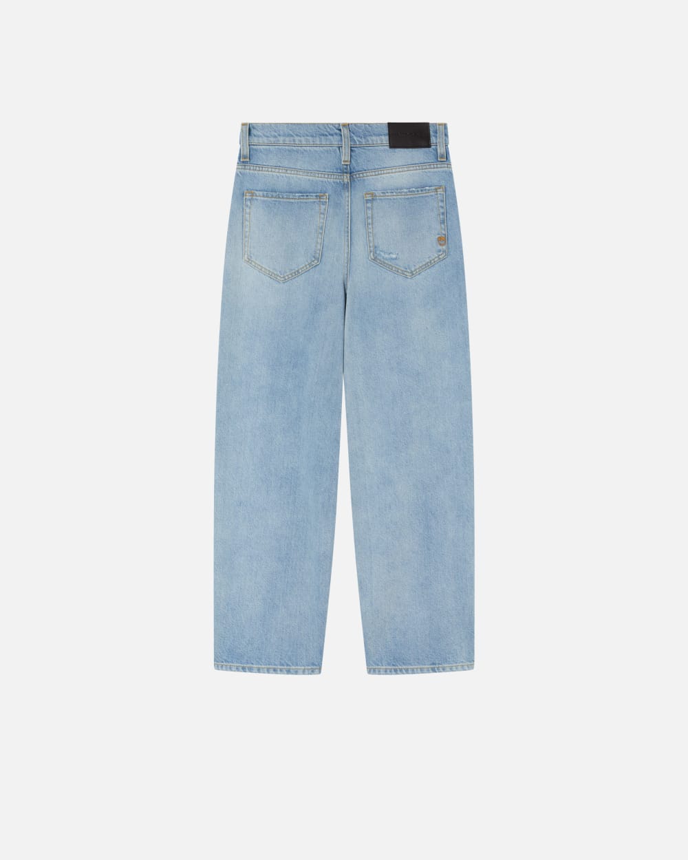 Jean taille basse cinq poches à la coupe ovoïde, arrondie et légèrement large, en denim confort à délavage vintage clair complété par des déchirures pour un effet destroy. Fermeture zippée et bouton clou en métal.