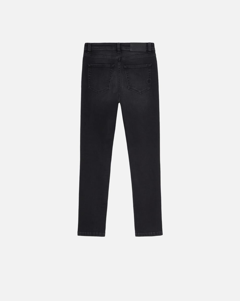 Jean skinny cropped à cinq poches en denim noir stretch. Taille régulière avec passants de ceinture, longueur cropped et broderie Love Birds sur une des poches arrière. Fermeture zippée et bouton clou en métal.