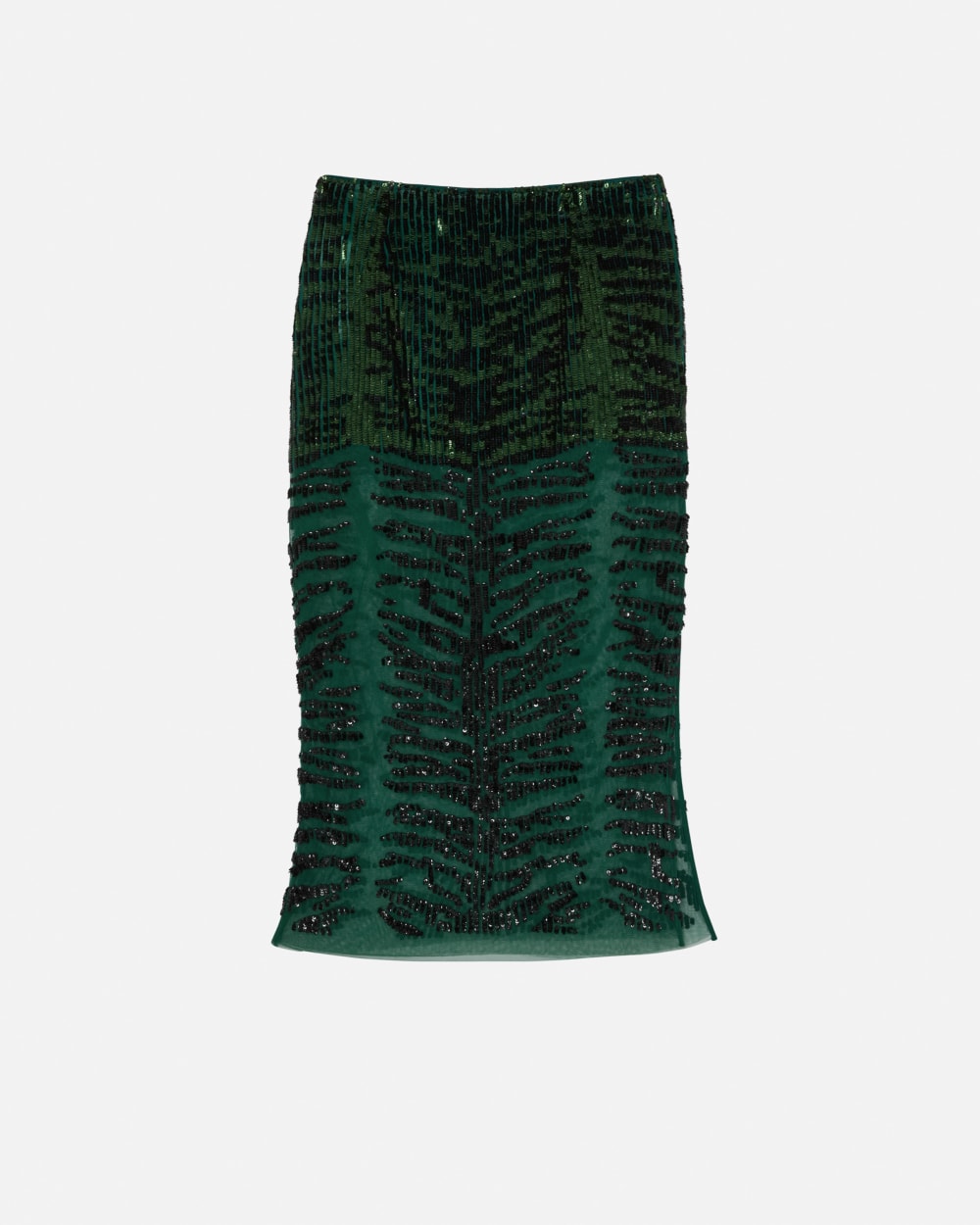 Jupe mi-longue, à mi-mollet, en tulle léger, brodée de paillettes cuvettes créant un motif zébré. La broderie présente un motif dense et couvrant en haut de la jupe, qui s’éclaircit au fur et à mesure que l’on descend vers le bas du vêtement, laissant entrevoir le tulle en transparence.
