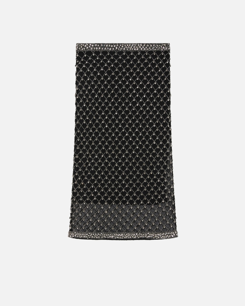 Jupe midi en tulle noir avec motif en filet de micro-cristaux lumineux sur toute la surface, entièrement travaillée au métier à tisser. La transparence ajoute une touche de légèreté et de sensualité, tandis que les détails brodés donnent un effet sophistiqué et luxueux. Parfaite pour les événements spéciaux : une uvre d’art qui transforme chaque tenue en une déclaration de style.