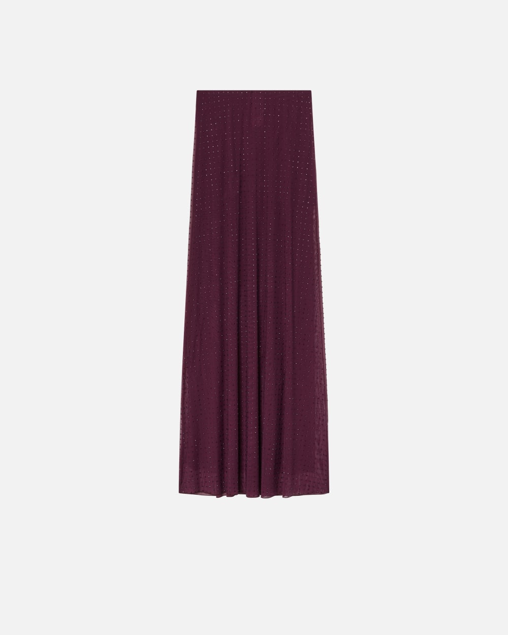 Jupe droite longue en tulle léger transparent ornée de strass ton sur ton appliqués all-over. Élastique à la taille.