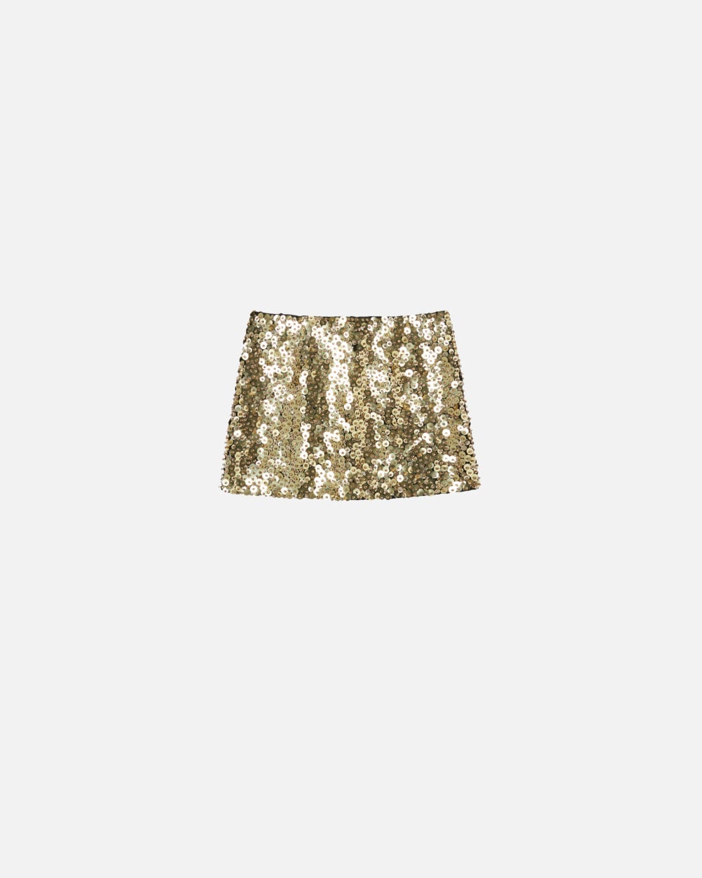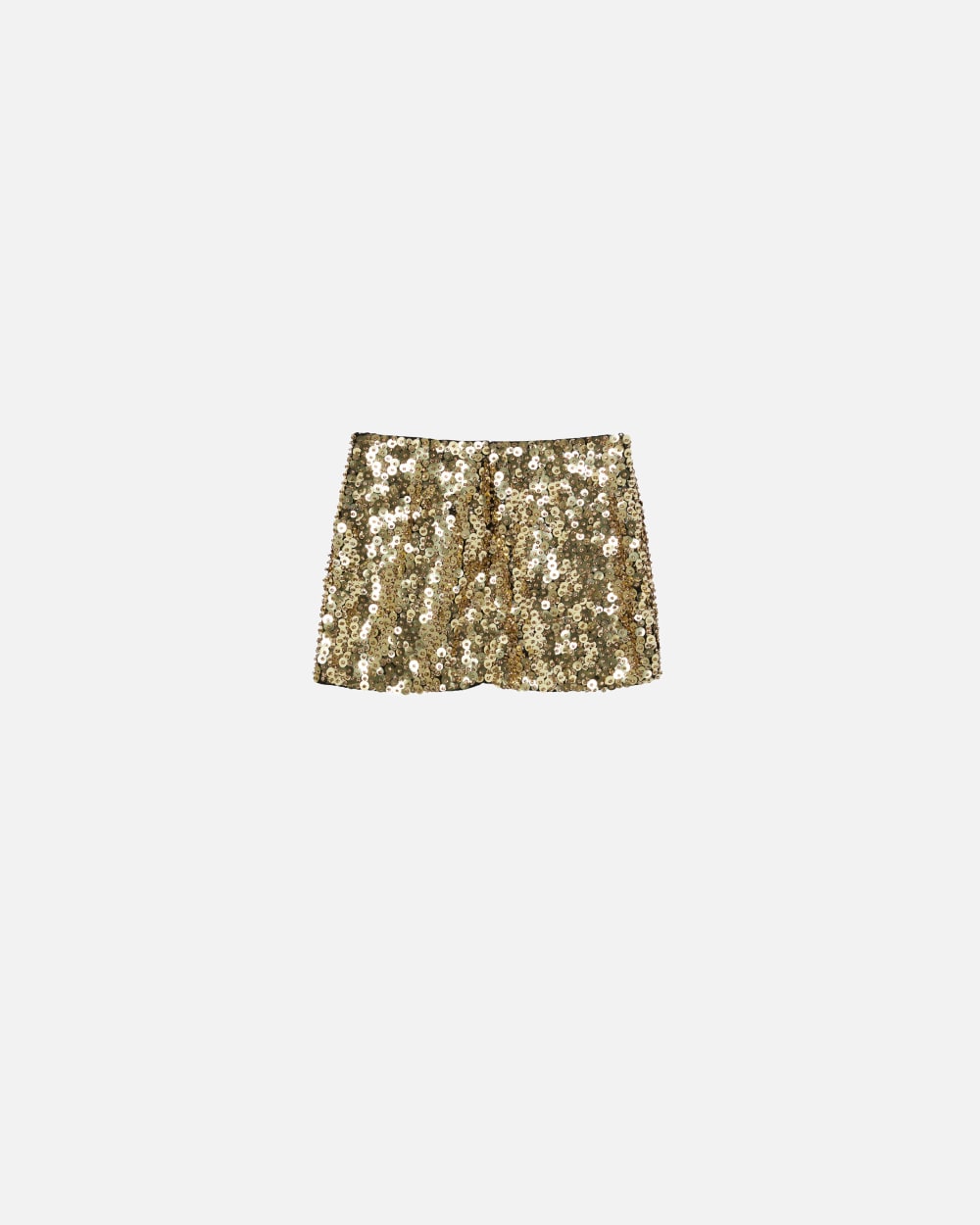 Mini-jupe évasée entièrement brodée de paillettes dorées avec strass enchâssés, un pour chaque paillette, afin de donner encore plus d’éclat à cette pièce originale. Cette mini-jupe vous accompagnera en soirée avec une touche audacieuse et féminine et ne passera pas inaperçue. Fermeture zippée invisible au milieu du dos.