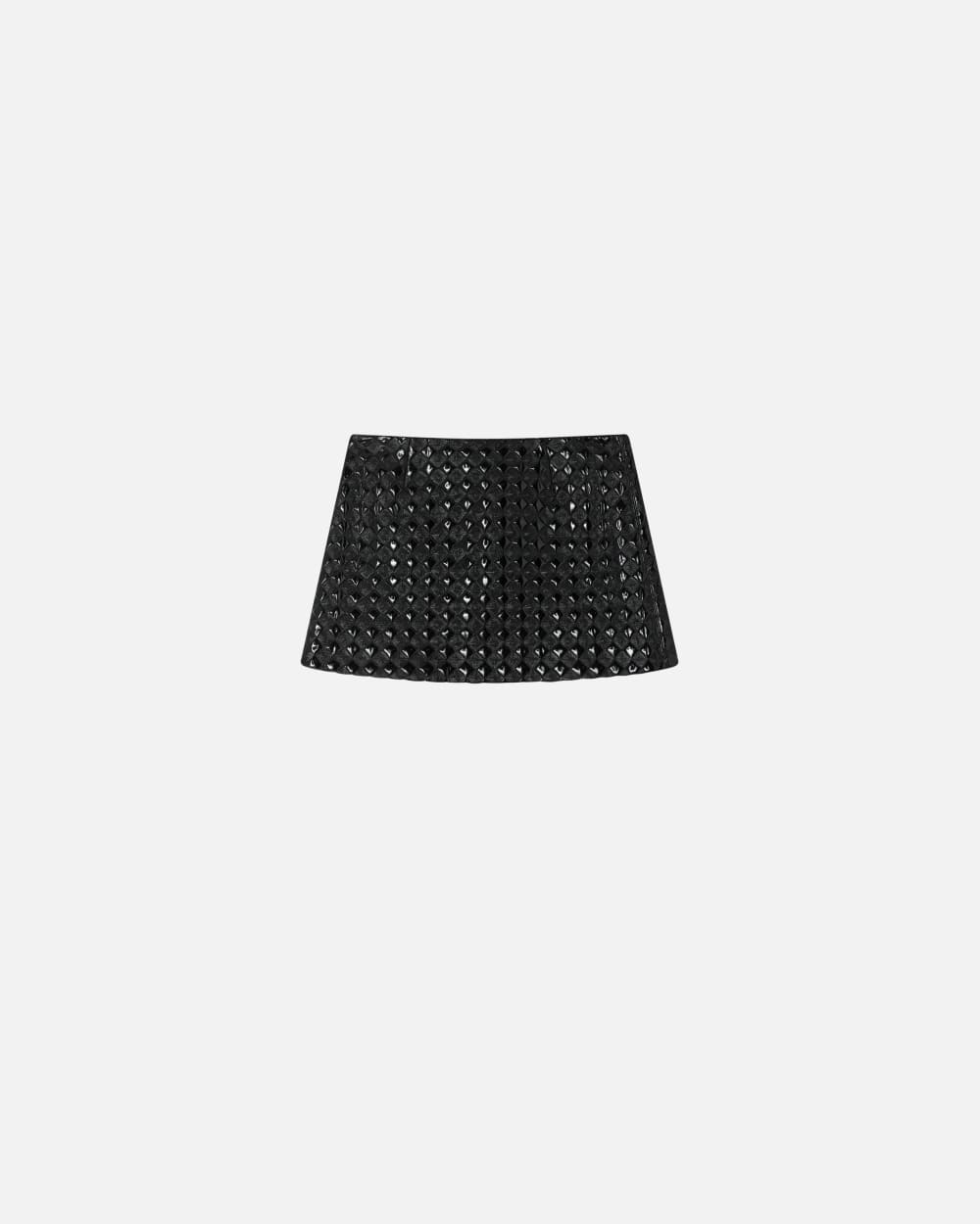 Mini-jupe moulante droite en tissu effet cuir verni à motif matelassé créant un jeu de textures brillantes et mates. Modèle doublé pour plus de confort et doté dune fermeture zippée invisible au milieu du dos pour faciliter lenfilage.