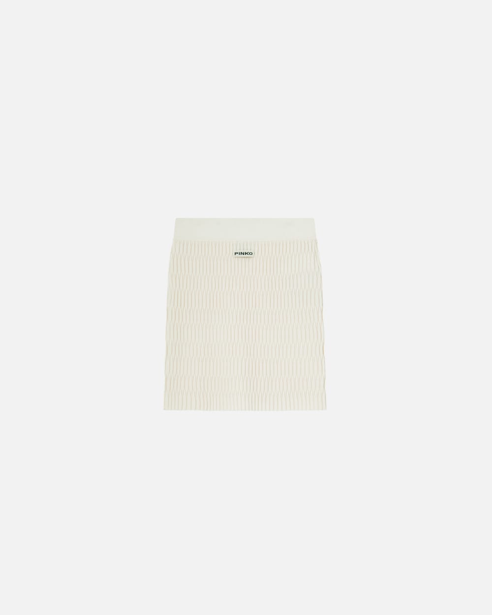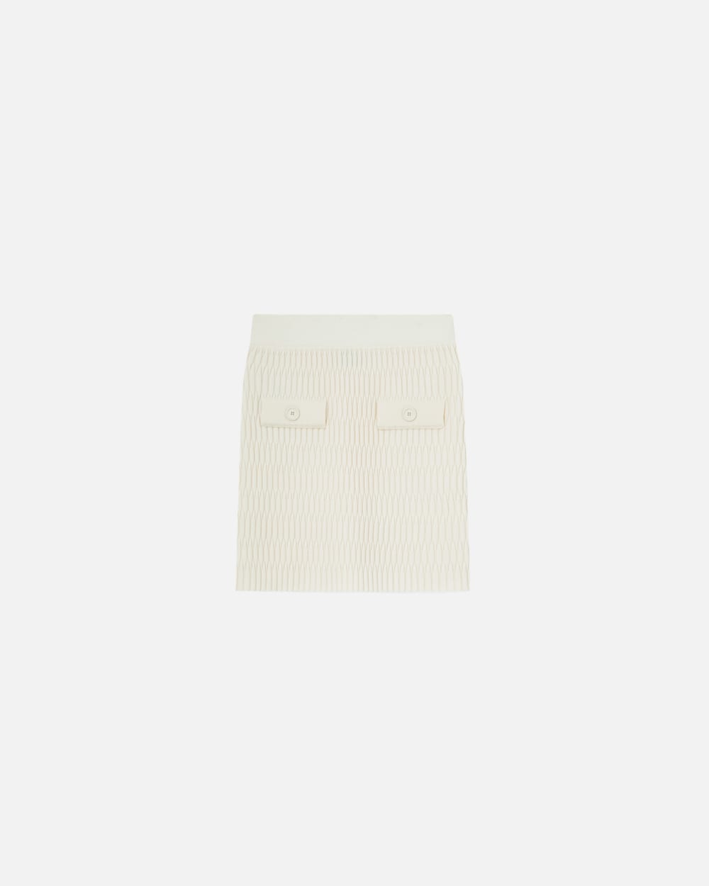 Mini-jupe moulante en maille géométrique de laine mélangée all-over. Modèle avec logo en intarsia contrastant au dos et deux faux rabats plaqués et boutonnés sur le devant, parfait en version total look avec la veste assortie ou pour créer des tenues de jour particulièrement féminines et originales.
