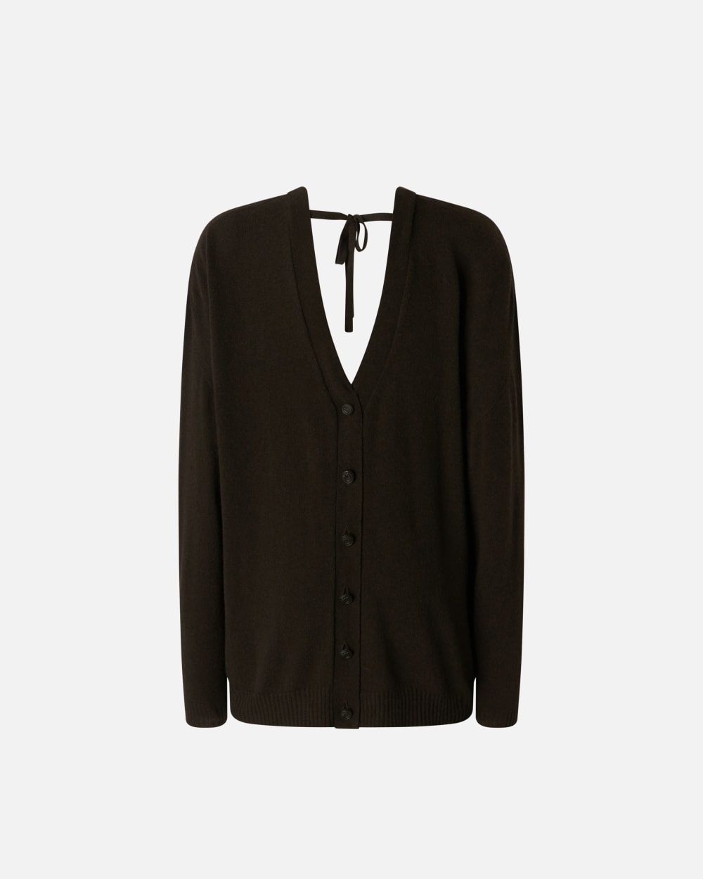 Cardigan en maille douce de laine et cachemire extra-fin à porter en journée avec col V plongeant et fermeture boutonnée, devant comme au dos. Col V au dos avec lien à nouer pour une touche féminine et pratique, vu quil permet déviter que le cardigan ne glisse sur les épaules. Un cardigan original à inclure dans votre garde-robe quotidienne en ce début de saison.