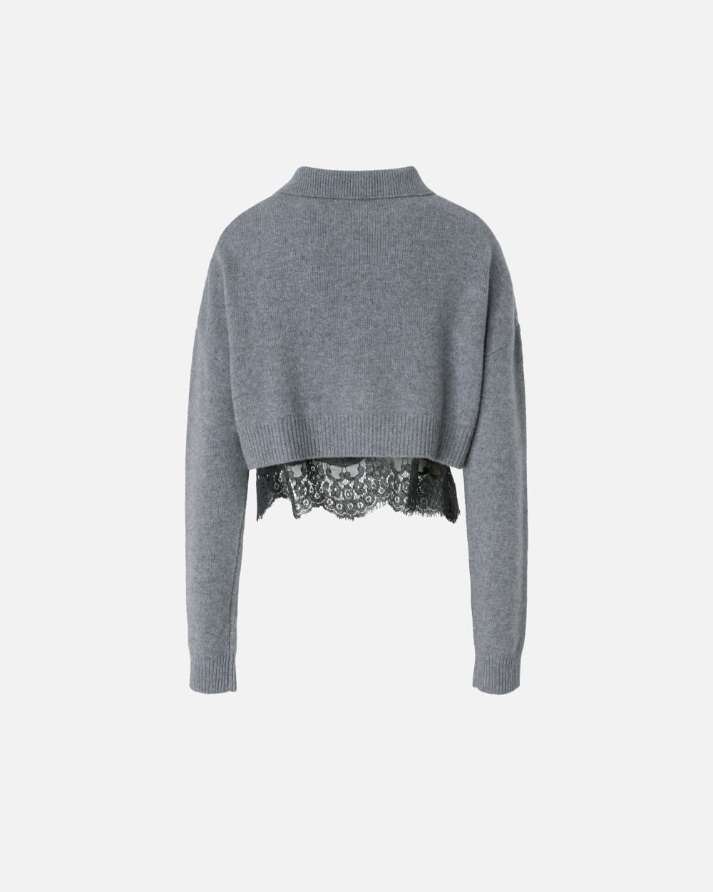 Cardigan cropped en laine et cachemire rehaussé dun top en satin de viscose brillant bordé de dentelle à la base. Modèle court laissant entrevoir la dentelle féminine du top. Coupe boxy à col chemise et manches longues à bords-côtes. Ce cardigan est le vêtement idéal pour apporter une touche féminine à vos looks quotidiens sans renoncer au confort d’une pièce en maille. Fermeture boutonnée sur le devant.
