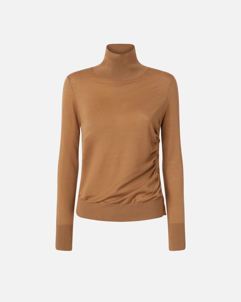 Pull ajusté à col roulé et manches longues en maille légère 100 % laine avec patte de boutonnage sur un côté permettant de créer une fente plus ou moins grande au bas du vêtement.