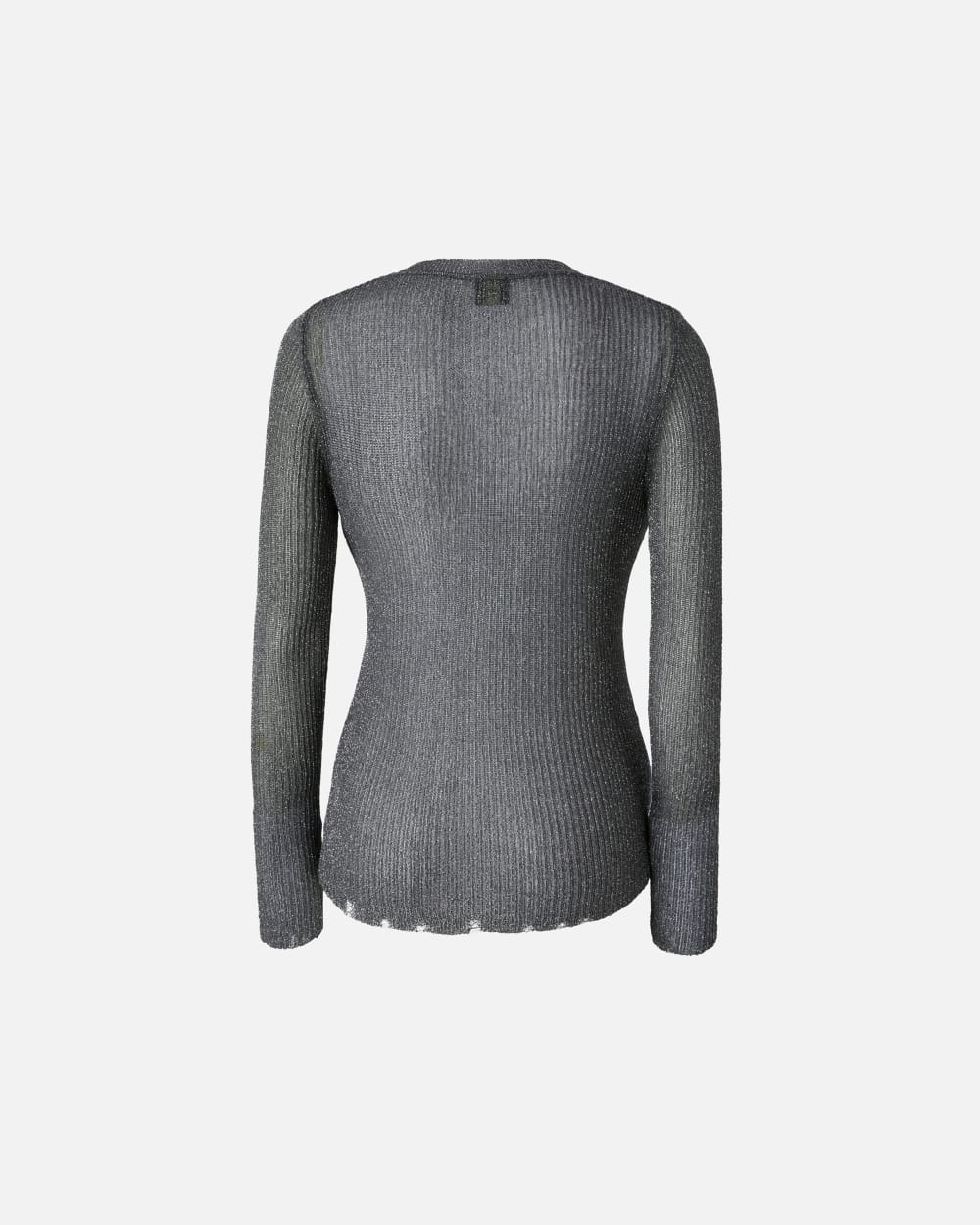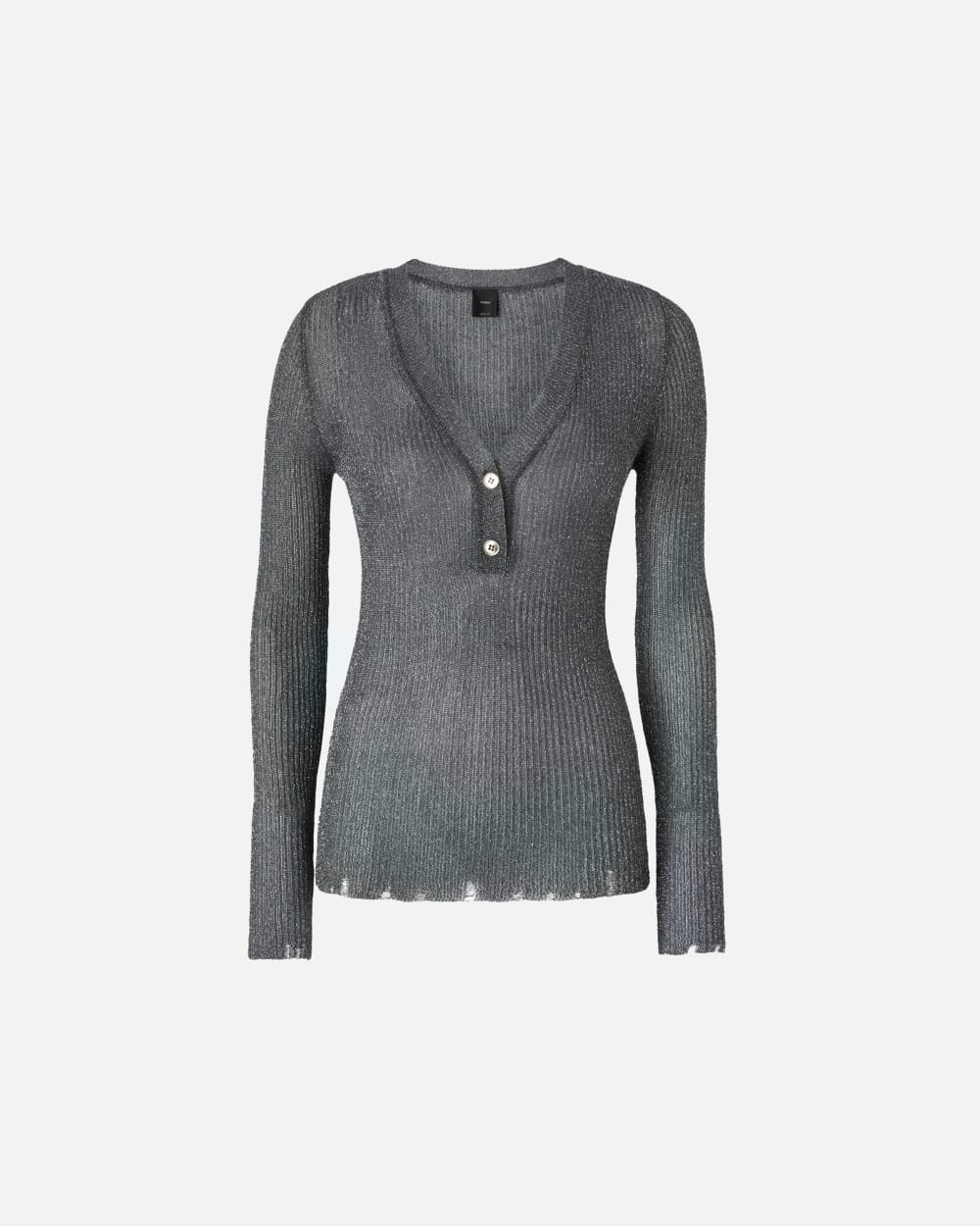 Pull côtelé à manches longues en fil lurex ultraléger pour un effet métallisé. Coupe ajustée avec encolure en V à double bouton et effet destroy à la base.