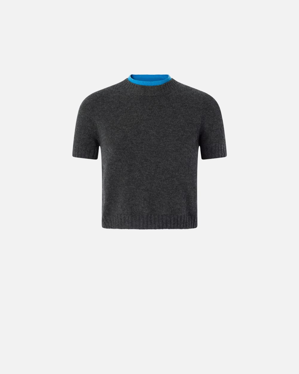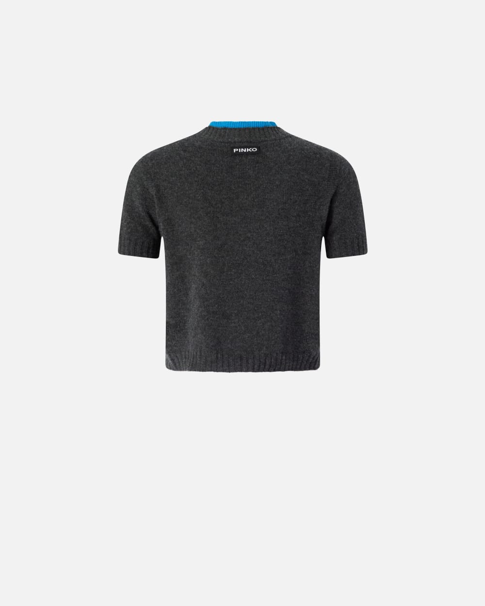Pull cropped à manches courtes en douce maille de laine et cachemire avec col légèrement montant à bordure contrastante. Sa coupe courte avec finitions bords-côtes élégantes en fait une pièce parfaite à porter sous vos blazers préférés. Modèle griffé dune étiquette logotée PINKO cousue au dos.