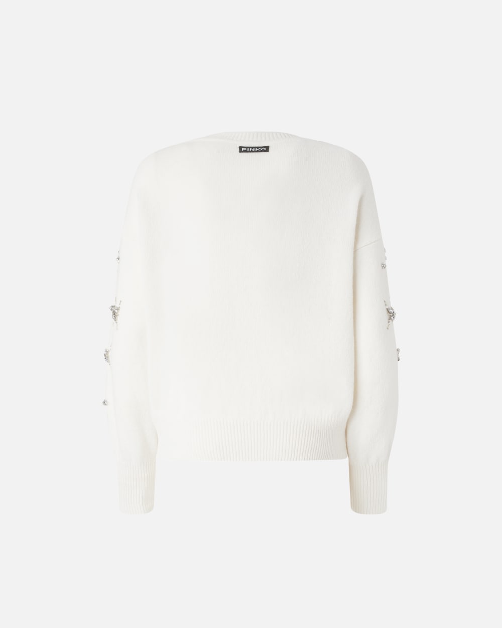 Pull élégant en maille de laine et cachemire orné de strass et de pierres brodés sur le devant pour apporter une touche scintillante et féminine à votre collection de pulls. Coupe boxy à encolure bateau et manches longues montées basses, presque chauve-souris. Modèle griffé dune étiquette à logo PINKO sur la nuque.