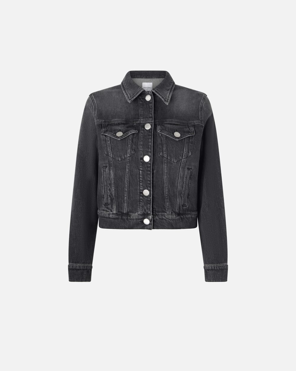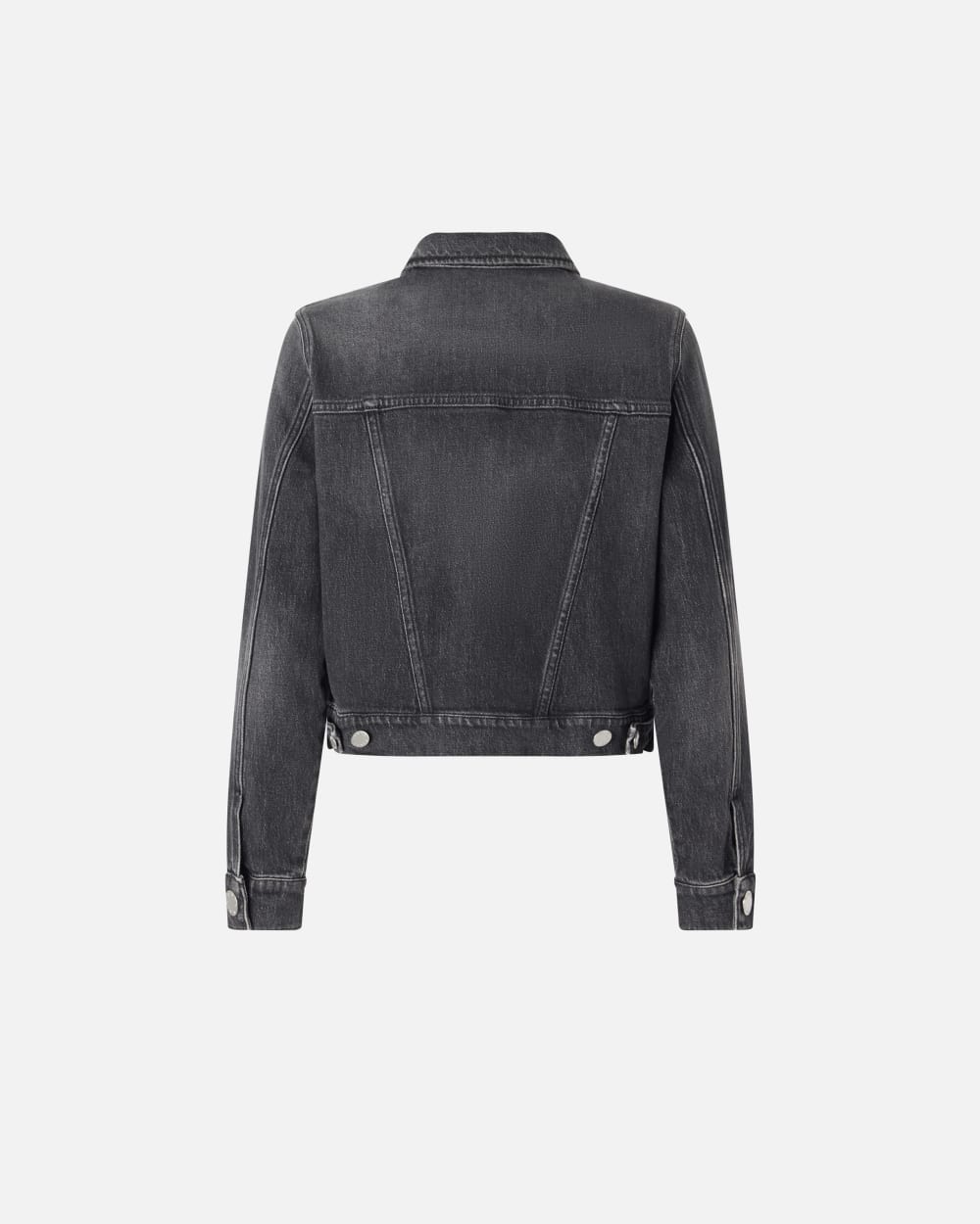 Blouson en denim à délavage vintage gris foncé. Petit col chemise, manches longues boutonnées, poches poitrine plaquées à rabat triangulaire et poches passepoilées verticales sur les hanches. Modèle emblématique rehaussé de surpiqûres verticales. Fermeture par boutons clous en métal sur le devant.
