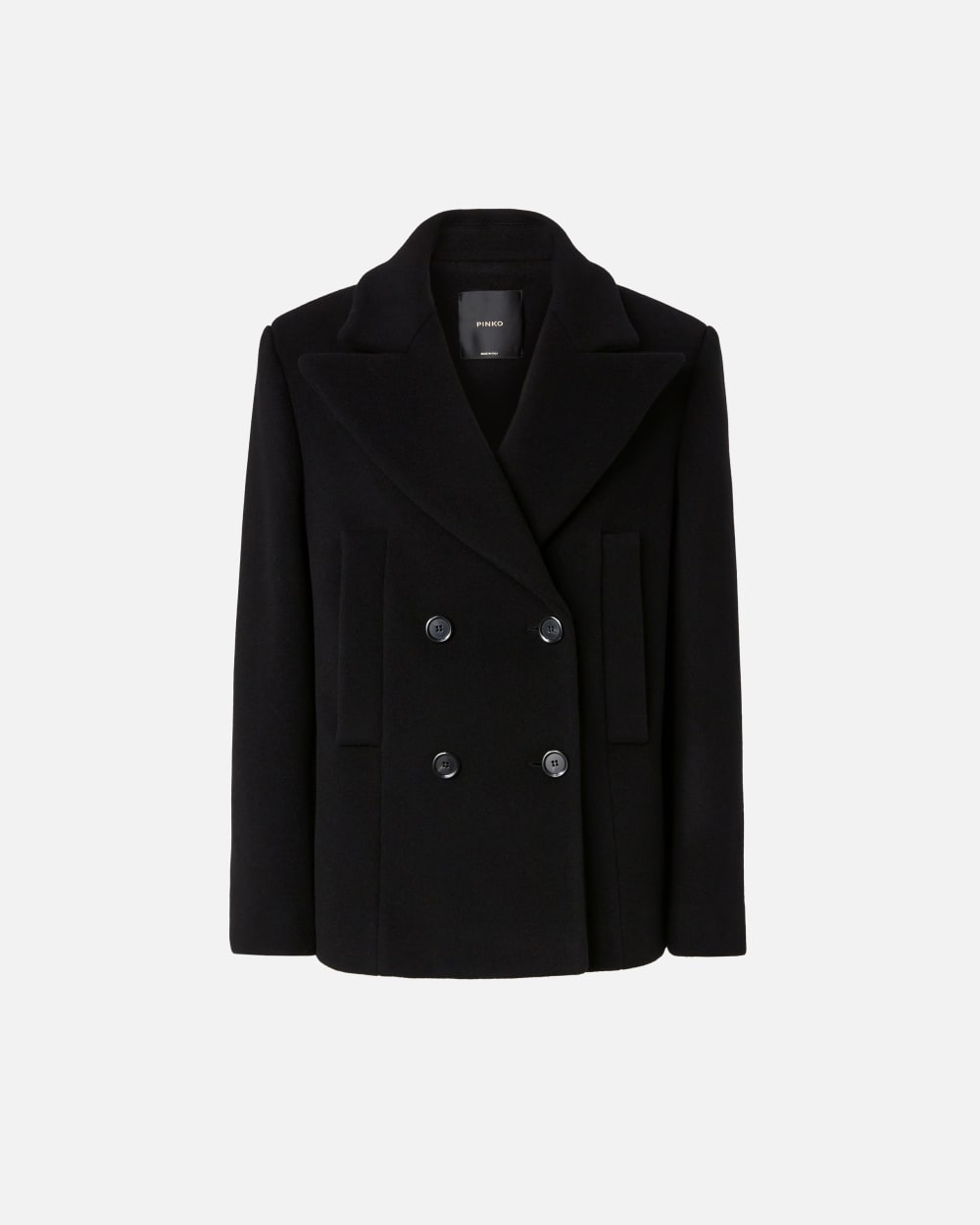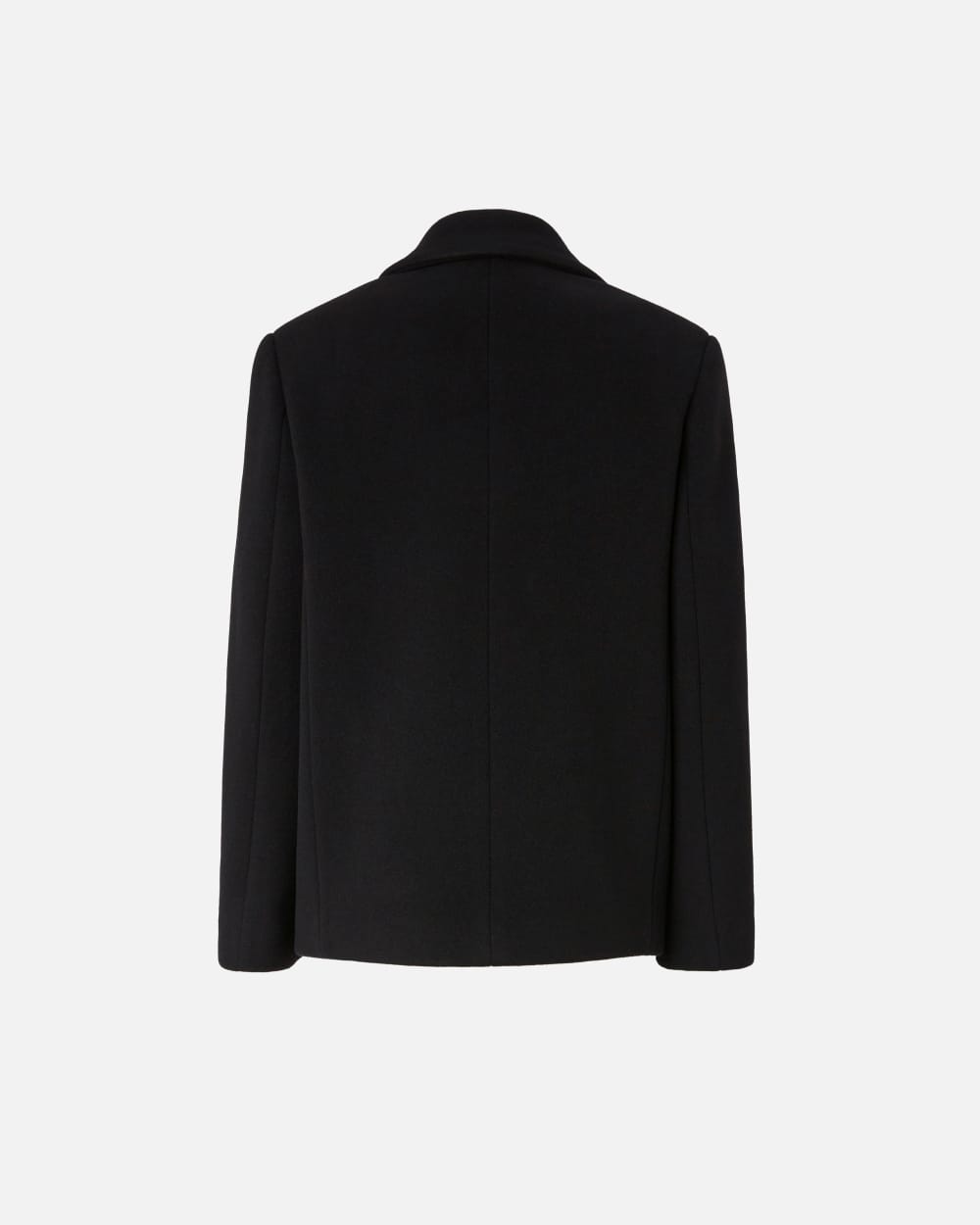 Manteau court croisé façon caban en drap de laine mélangée. Coupe droite avec large col à revers, manches montées et grandes poches à passepoil vertical sur les hanches. Modèle doublé à fermeture croisée boutonnée.