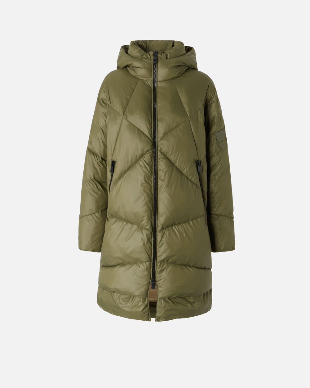 Doudoune rembourrée et matelassée en chintz technique, particulièrement brillante grâce à une finition spéciale. Coupe évasée avec poches zippées sur les hanches et col montant à capuche pour un maximum de confort y compris par temps froid et quand la météo fait des siennes. Écusson caoutchouté avec logo Love Birds sur l’une des manches longues. Rembourrage en matière synthétique et doublure en tissu. Fermeture zippée à double curseur sur le devant.