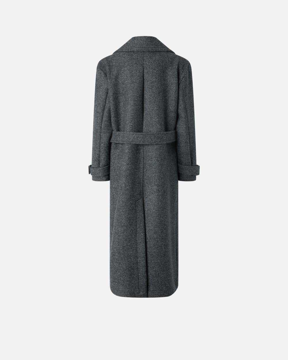 Manteau long croisé en sergé de laine mélangée teint en fil. Modèle esprit trench classique avec col à revers, manches longues avec pattes aux poignets et ceinture assortie dans le même tissu à nouer à la taille. Poches en biais sur les hanches et fermeture croisée boutonnée.