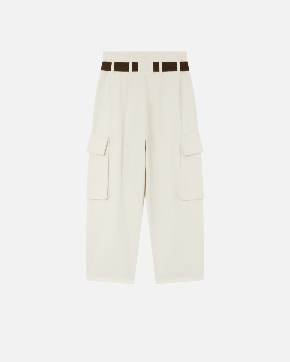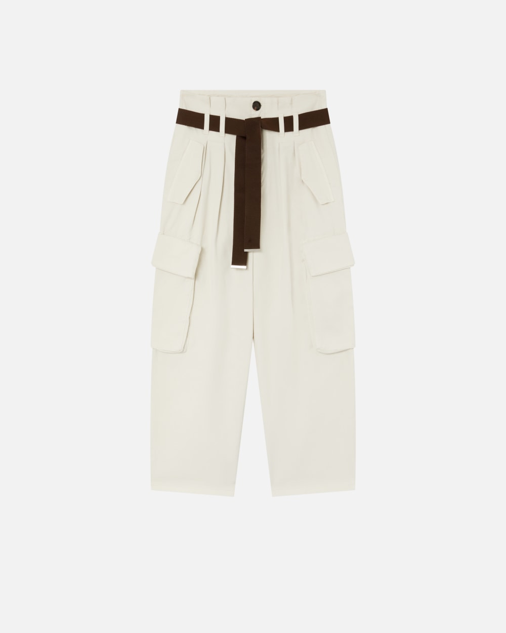 Pantalon cargo oversize en gabardine teinte. Taille haute plissée façon paper bag, qui rehausse la silhouette, avec ceinture assortie à nouer. Coupe ample avec poches à rabat triangulaire sur les hanches et grandes poches utilitaires à soufflet sur les côtés. Fermeture zippée et bouton.