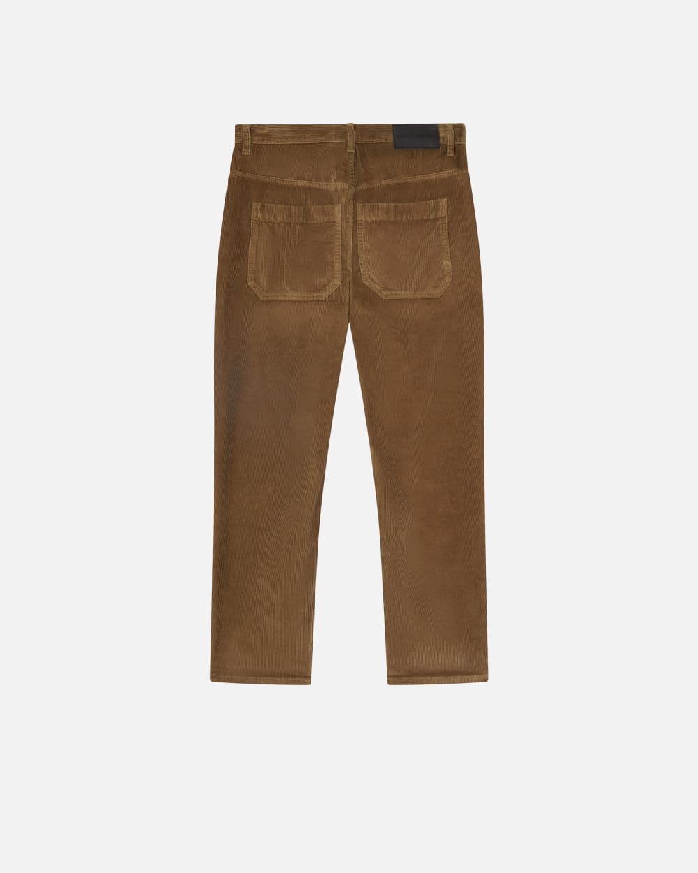 Pantalon chino long en velours milleraies à côtes très fines. Taille moyenne avec passants pour ceinture et étiquette en cuir au dos. Poches plaquées sur le devant et au dos et coupe fuselée avec pli central sur le devant et au dos. Fermeture zippée et bouton clou en métal.