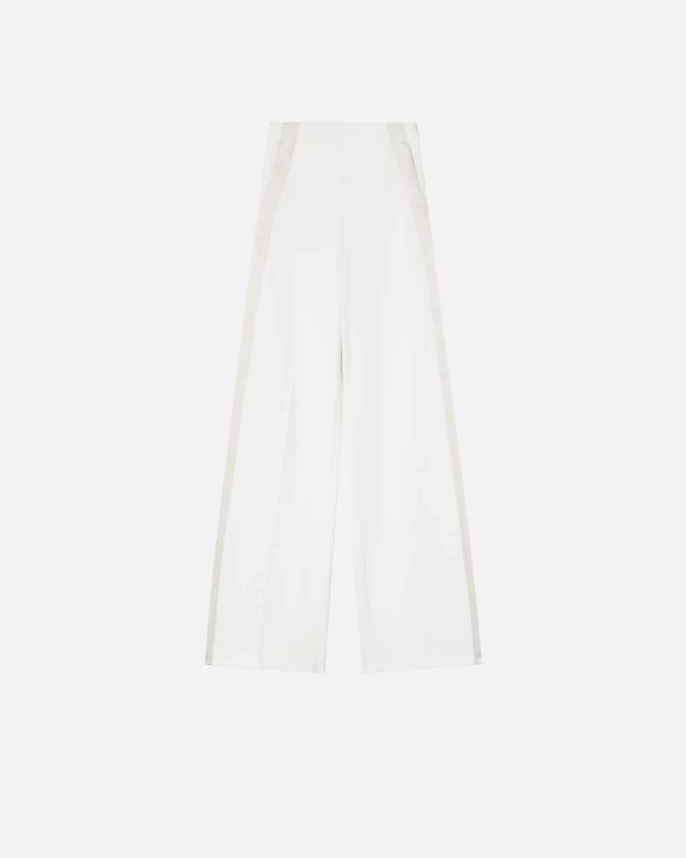 Pantalon palazzo élégant en double sergé de viscose mélangée stretch avec bande latérale en tissu brillant ton sur ton. Coupe taille haute avec poches cavalières sur les hanches, poches passepoilées au dos et fermeture zippée invisible sur le côté pour une silhouette épurée et élégante. Ce pantalon wide leg, à choisir en noir ou en blanc, est idéal pour un look habillé, mais également parfait en journée, associé à une pièce en maille raffinée.