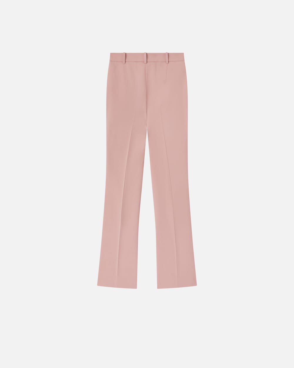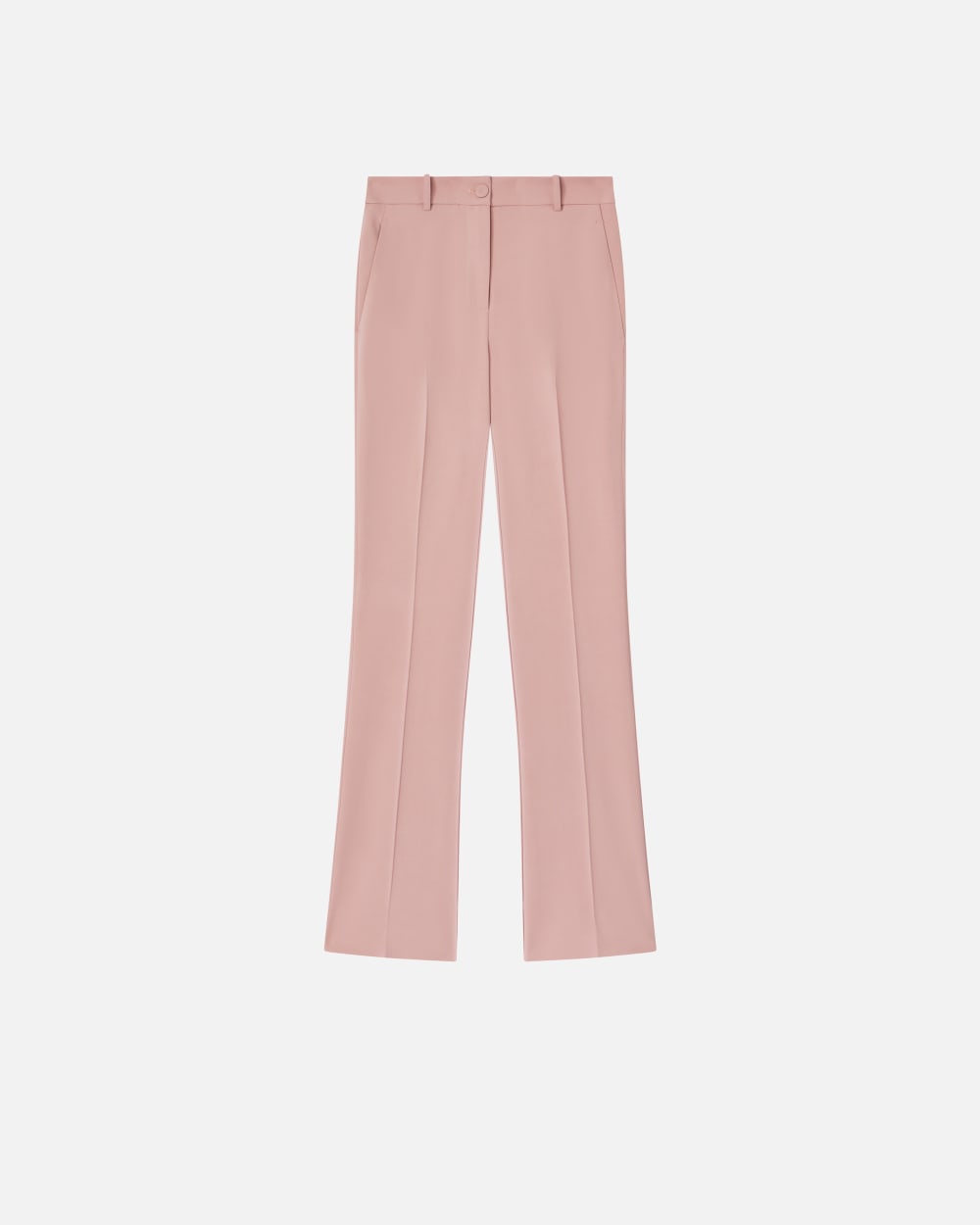 Pantalon patte d’éph en cady technique. Taille classique avec passants pour ceinture, jambe ajustée jusqu’au genou puis évasée vers le bas et poches cavalières sur les hanches. Fermeture par bouton et zip.