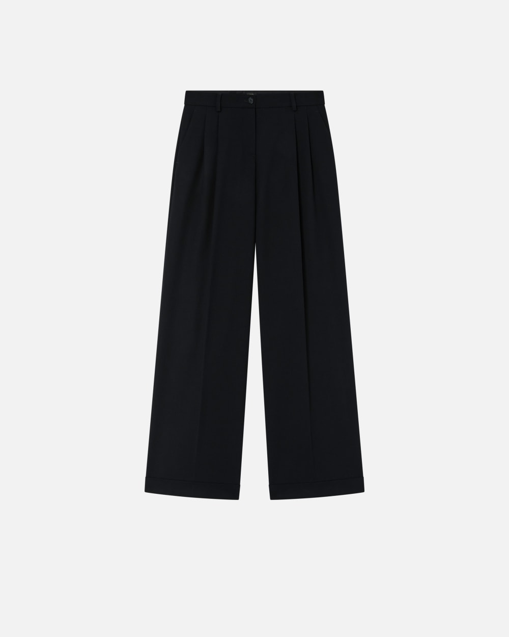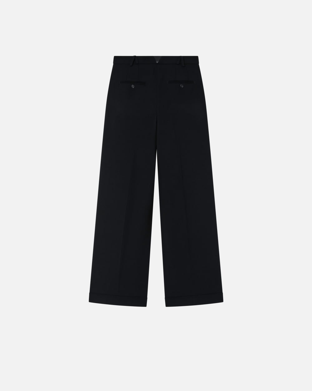 Pantalon large en twill de laine mélangée stretch avec empiècement triangulaire en tissu contrastant effet cuir au dos de la taille. Coupe esprit tailleur avec passants de ceinture et pinces à la taille, poches cavalières à la taille et poches passepoilées boutonnées au dos. Fermeture par agrafe et zip invisible.