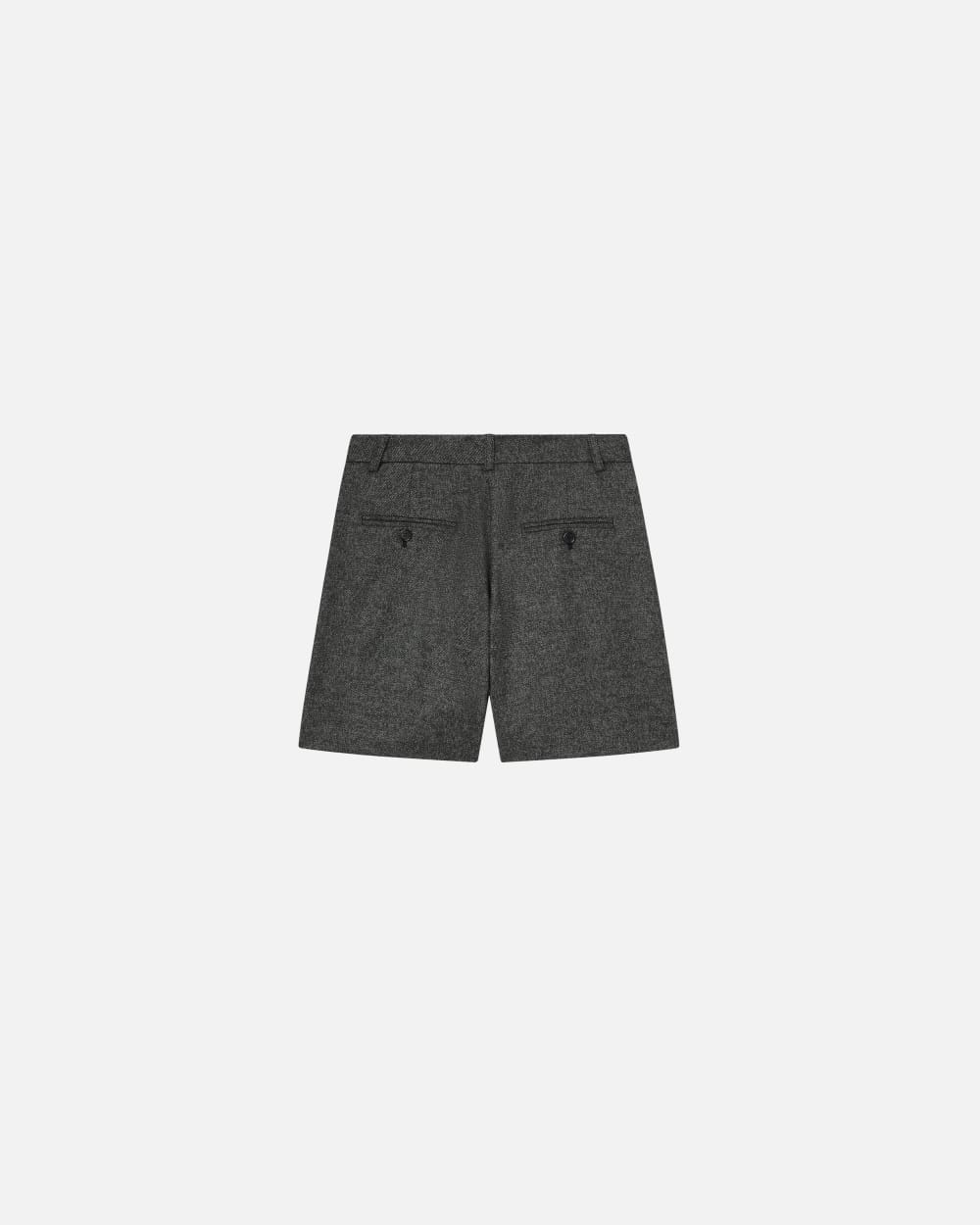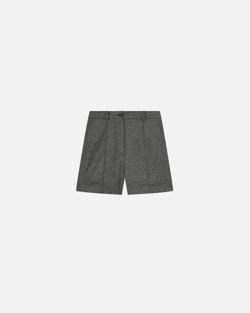 Short tailleur en flanelle de laine mélangée effet fil-à-fil. Ce modèle avec passants de ceinture à la taille, poches cavalières sur les hanches et surpiqûres verticales est parfait pour apporter une touche délégance même aux looks les plus décontractés. Fermeture zippée et bouton.