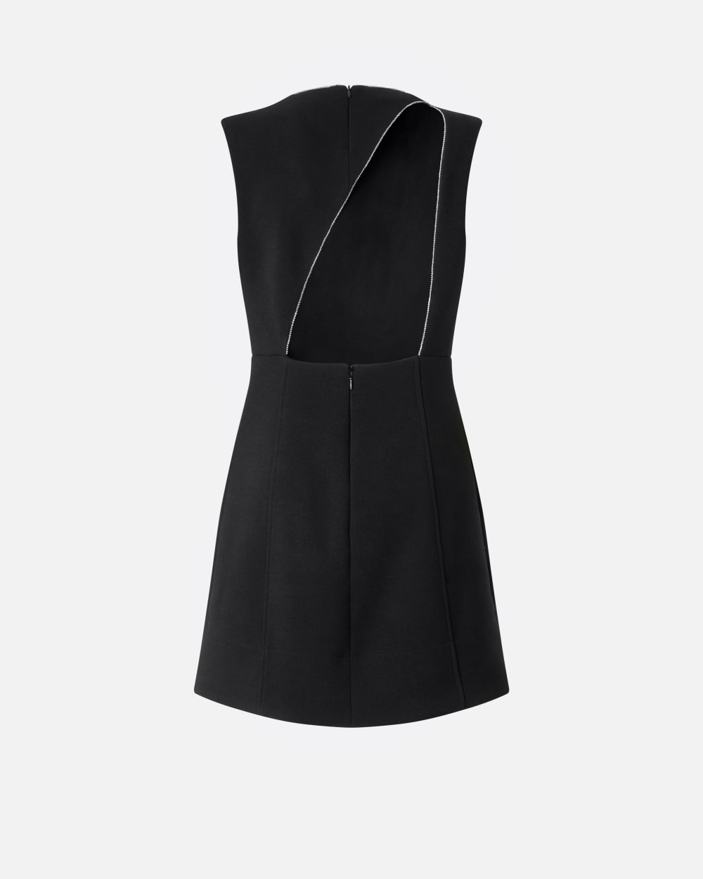 Robe de soirée courte style fourreau en double crêpe avec une ouverture asymétrique à l’arrière laissant une partie du dos dénudé. L’encolure ronde de la robe et l’ouverture dans le dos sont rehaussées de bords en strass, qui ajoutent une touche scintillante. Cette robe sans manches se caractérise par une coupe droite, avec une mini-jupe légèrement évasée et une glissière invisible au milieu du dos. Cette mini-robe est une réinterprétation précieuse et encore plus féminine du look élégant le plus classique, comme la petite robe noire, parfaite pour toute occasion spéciale.