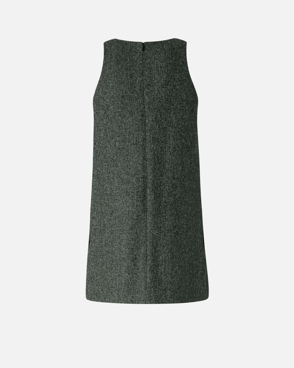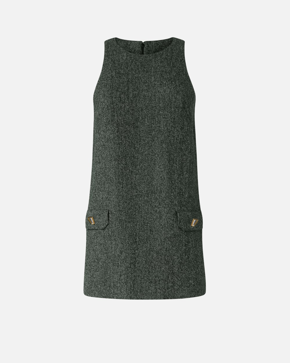Robe chasuble courte sans manches en maille boutonnée à la texture tridimensionnelle obtenue grâce à un processus particulier lors de la filature. Coupe évasée avec rabats plaqués sur les hanches et boutons géométriques effet miroir. Avec cette mini-robe, qui se combine facilement avec des pulls, des tops et des chemises, créer un look de jour féminin, raffiné et élégant sera un jeu denfant.