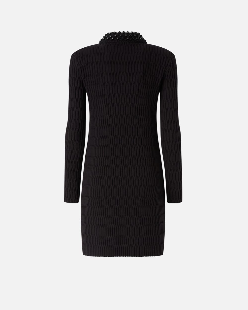 Robe courte moulante en maille géométrique de laine mélangée créant un motif optique en 3D. Réalisé en maille crochet et orné de perles ton sur ton, son col polo à trois boutons est amovible grâce à un bouton intérieur. Décontractée, mais parée de détails précieux, sa jupe est rehaussée de deux mini rabats plaqués, dont lun brodé du logo PINKO contrastant.